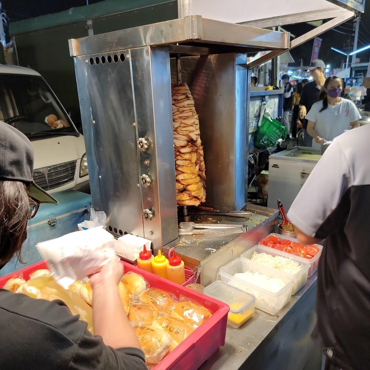 It's a very crowded night market, and shawarma is one of the popular dishes. The simple yellow sign paired with rotating skewers of meat gives a nostalgic vibe as you watch the owner slice off pieces of meat and lightly toast the bread; I believe this brings back childhood memories for many.