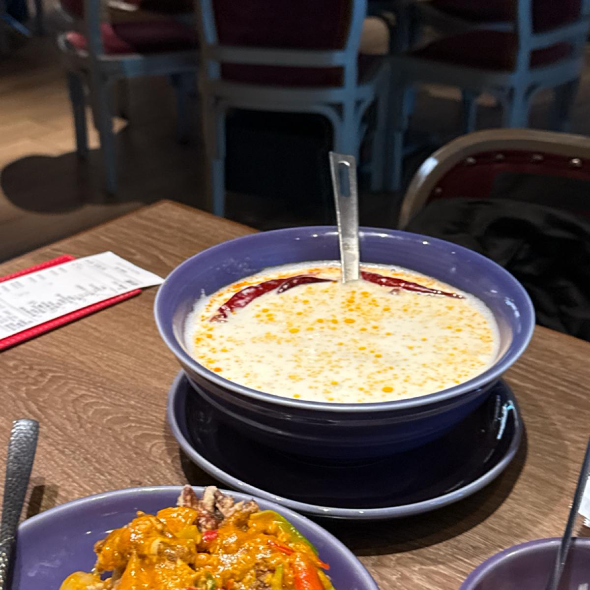 Rather than a coconut milk soup, it's more like "lemon juice soup." The acidity is very prominent, completely overshadowing the smoothness of the coconut milk; the first sip is quite shocking.
