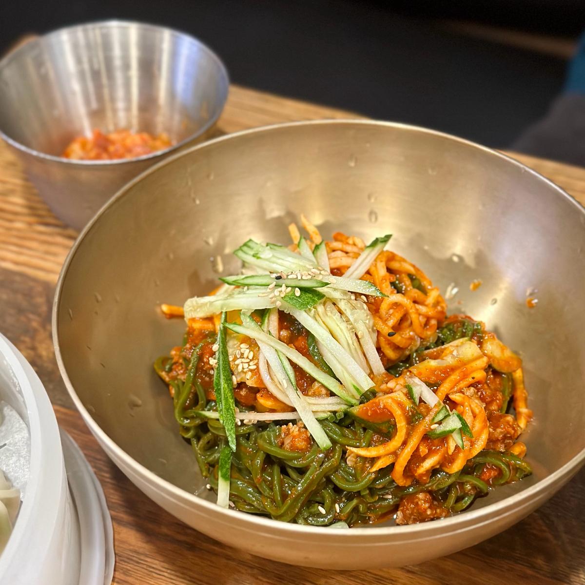 ✅ Noodle Salad: A type of Korean cold noodles. The reason the noodles appear green is that the restaurant adds green algae to them. The noodles themselves do not have a special flavor, but they have a very elastic texture. Paired with the sweet and spicy Korean sauce provided by the restaurant, it has a sweet taste characteristic of Korean cuisine, but it's not very spicy.