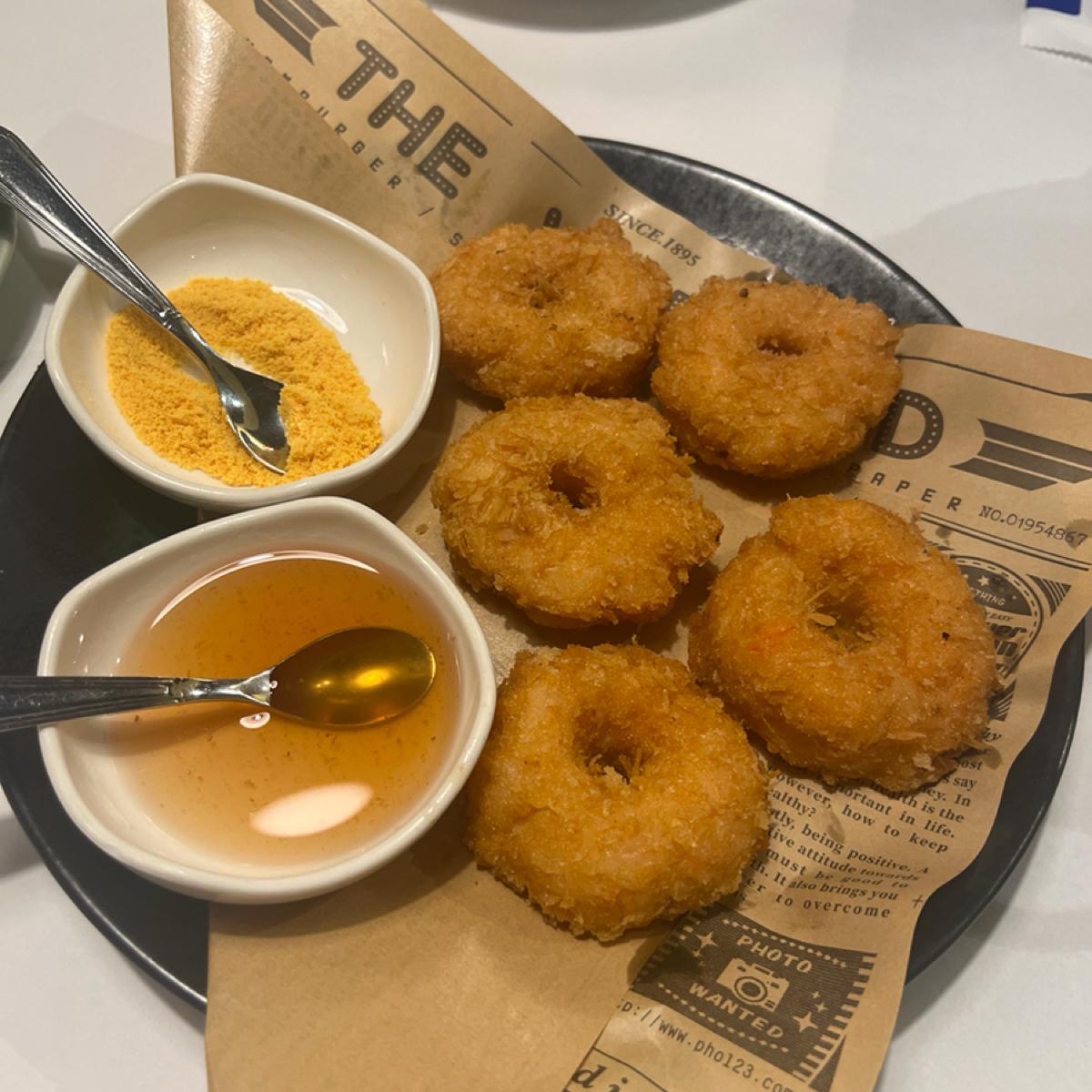 Shrimp rings 398$ (with plum sauce & salted egg yolk powder, the sweet and salty taste is very good😌I like this one the most
