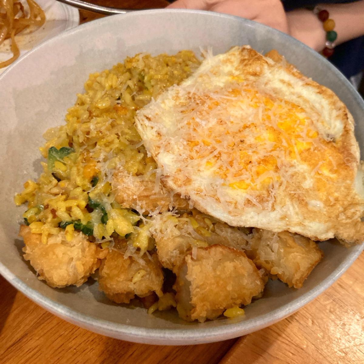 A friend ordered bitter melon rice with a moonview egg, and surprisingly, the bitter melon was mountain bitter melon. We thought it would be very bitter, but it wasn’t. Even a friend who usually dislikes bitter melon enjoyed it. This dish is suitable for those who don’t want to eat meat. The item that looks like chicken in the photo is actually king oyster mushroom, and the rice is flavorful and quite tasty.