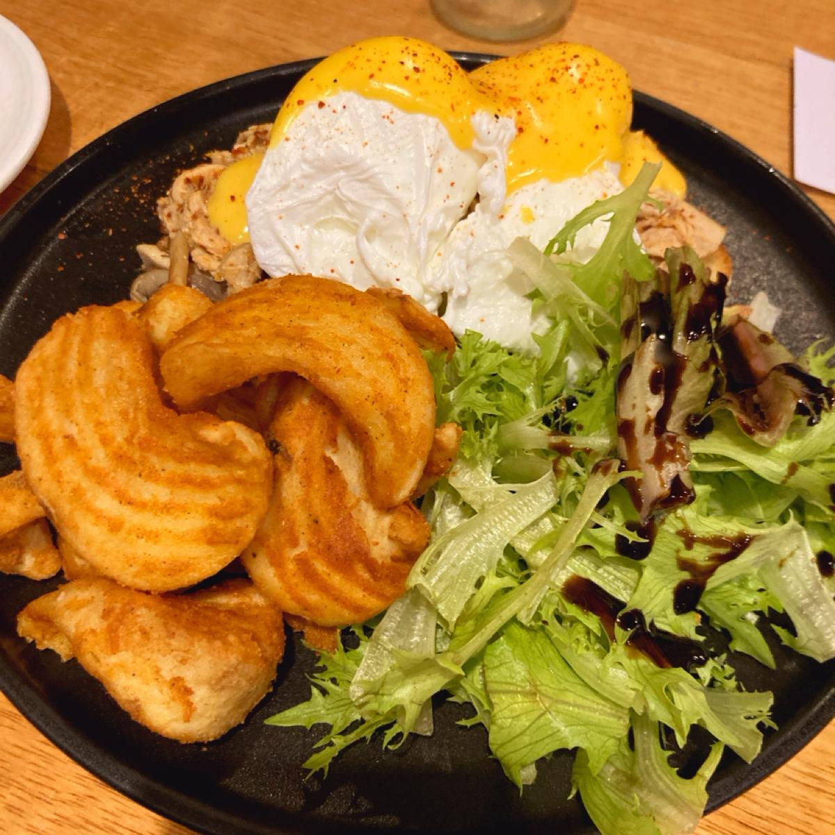 I ordered the Taiwanese-style saliva chicken Benny from the brunch menu. The portion is quite large and comes with two drinks; I chose tomorrow leaf tea and zero-calorie cola, which are both available for unlimited refills. The saliva chicken is served on European-style bread and has a considerable amount, but the flavor isn't too strong, which is nice for me as I prefer lighter dishes. Plus, there’s lettuce, making it healthier; however, since I eat fried food less often, there were a bit too many fries for my taste.