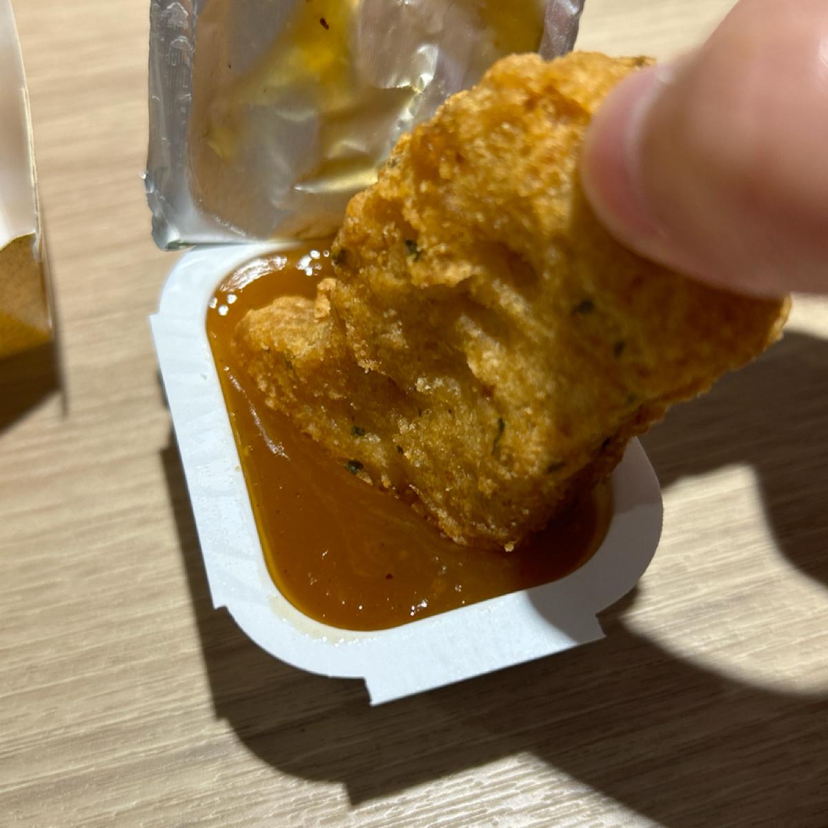 Today I went to the McDonald's near Hsinchu Railway Station for food. I heard that McDonald's Spicy Chicken McNuggets are back! In addition, there is a new dipping sauce "Fantasy Sauce" that is available for a limited time, which makes me eager to try it! The new dipping sauce "Fantasy Sauce" is garlic chutney, which sounds very flavorful and delicious! The difference between the Spicy Chicken McNuggets and the original Chicken McNuggets is that the outer coating has Indian Teja pepper shards and basili leaves, and the filling is filled with spicy seasonings such as chili and white pepper, giving it a unique multi-layered spiciness.
