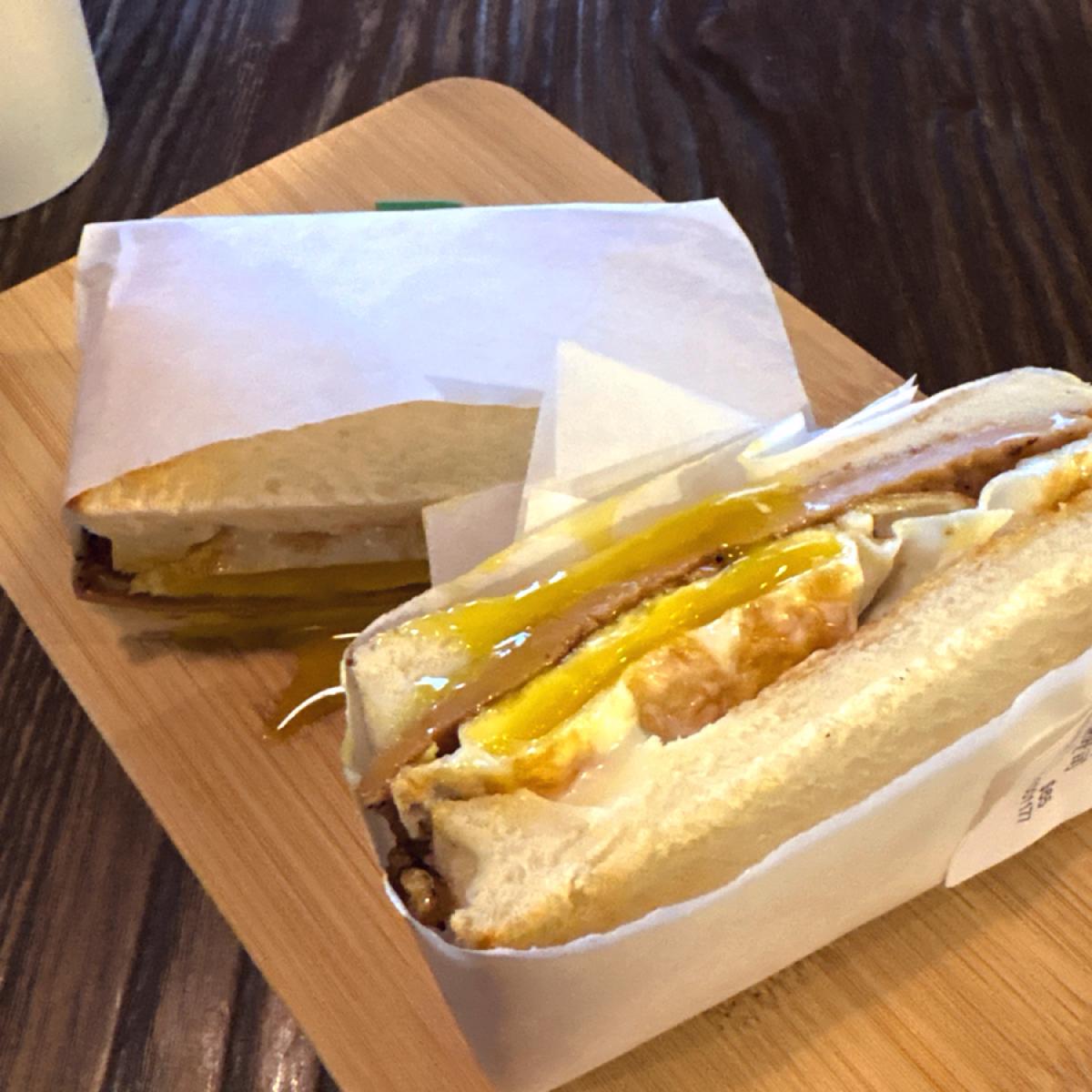 The menu mainly features toast. Besides a series of grilled meat and egg options, they also have basic tuna and meat floss, as well as sweet toast. Personally, I really enjoy the slices of meat grilled over charcoal, which adds a unique smoky flavor compared to those cooked on a frying pan. I also ordered a cup of basic black tea. The food was served quickly, and the shop had the foresight to cut the toast in half, which was a plus; it made sharing easier and packing leftovers more convenient. The toast had a slightly toasted and crispy exterior, with fillings of meat slices and a soft-boiled egg. The meat slices were thin, and I liked the half-cooked egg as it gave a more moist texture. As for the black tea, it was typical of breakfast shops—sweet and a bit astringent. I only drank half a cup before I discarded it.