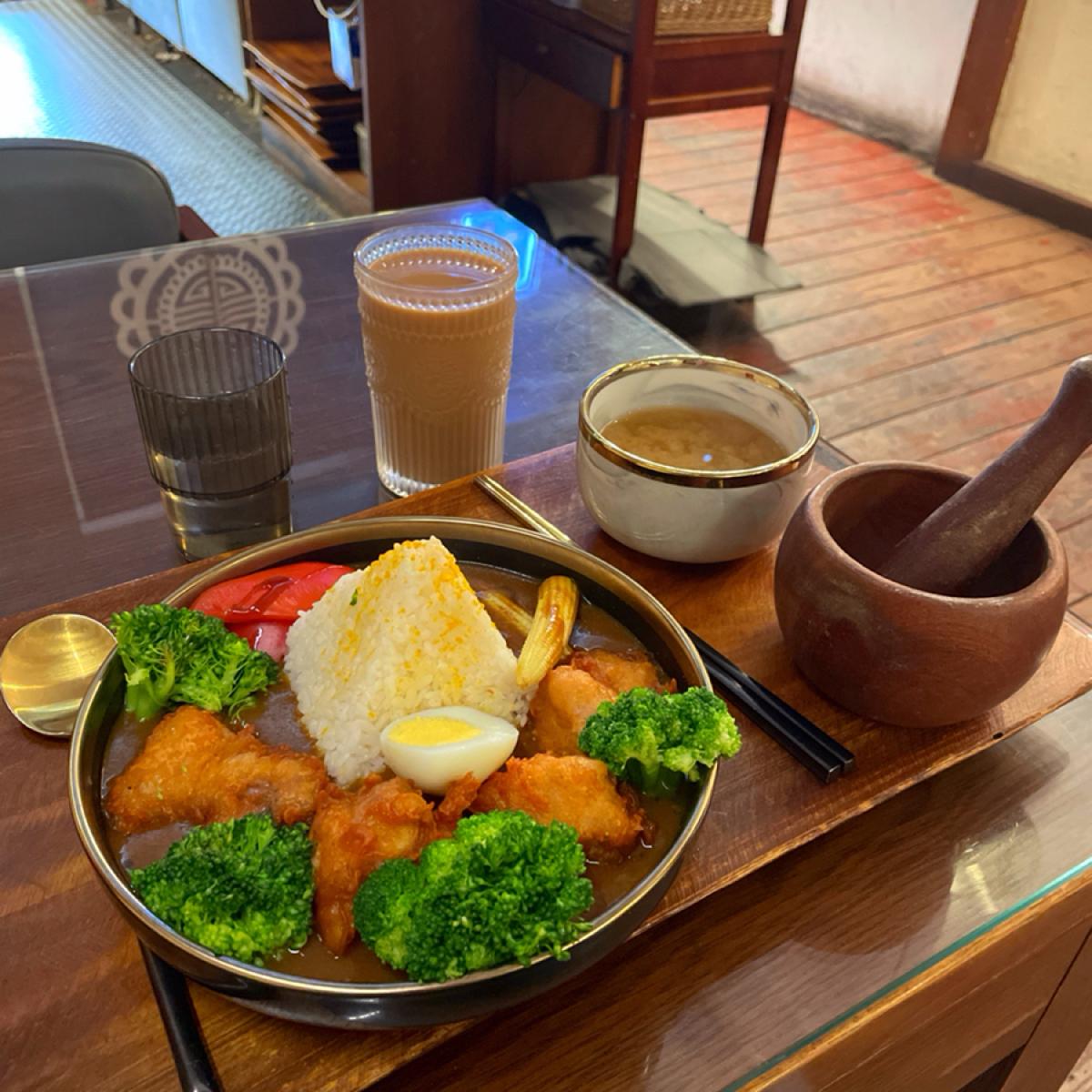 a curry-themed restaurant housed in a renovated old building,