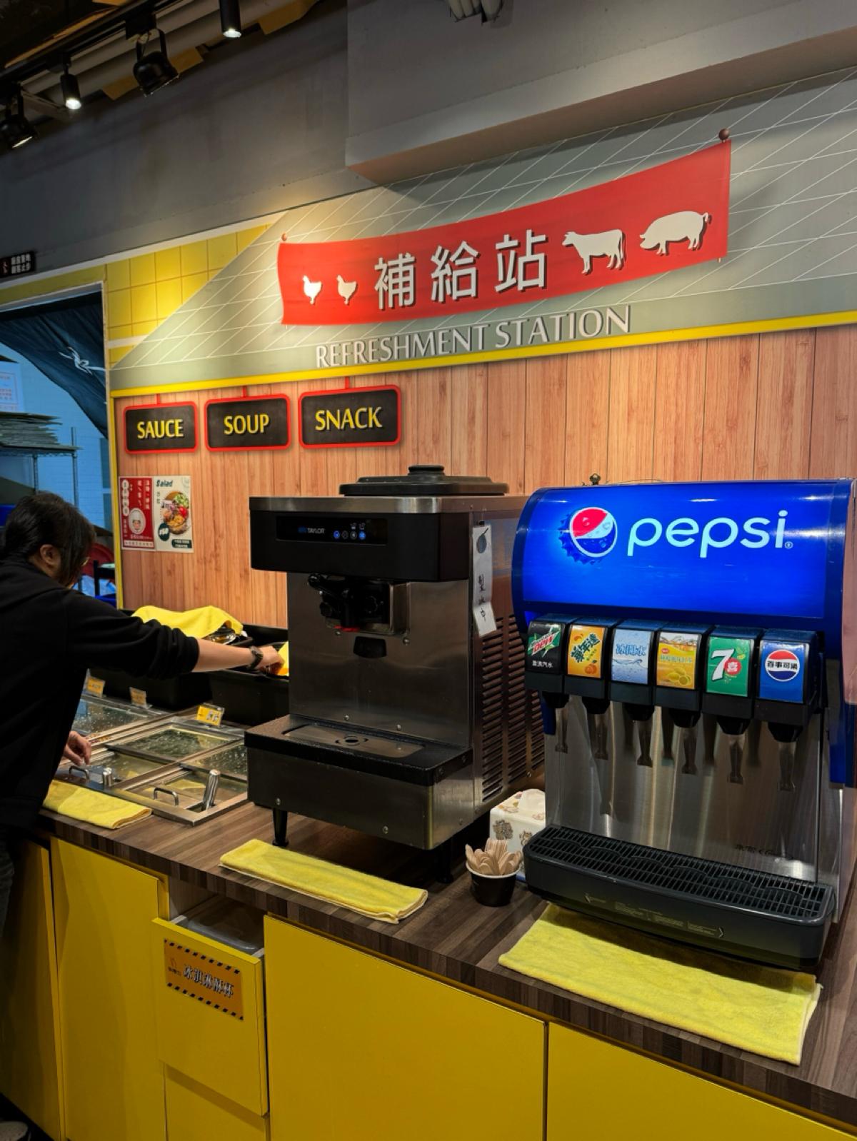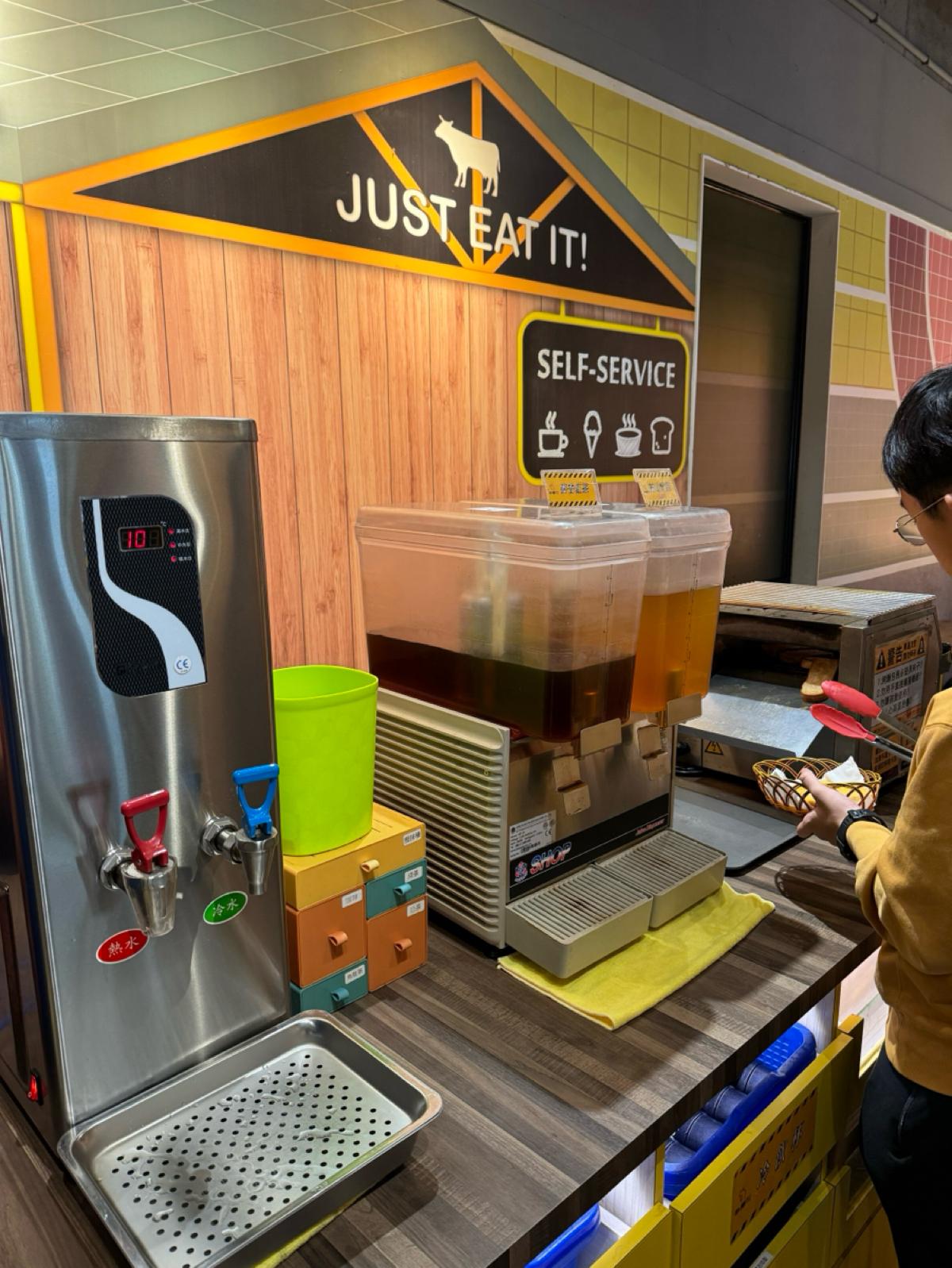The self-service bar has drinks, soup, and garlic bread that you can help yourself to, and you can order using a QR code.