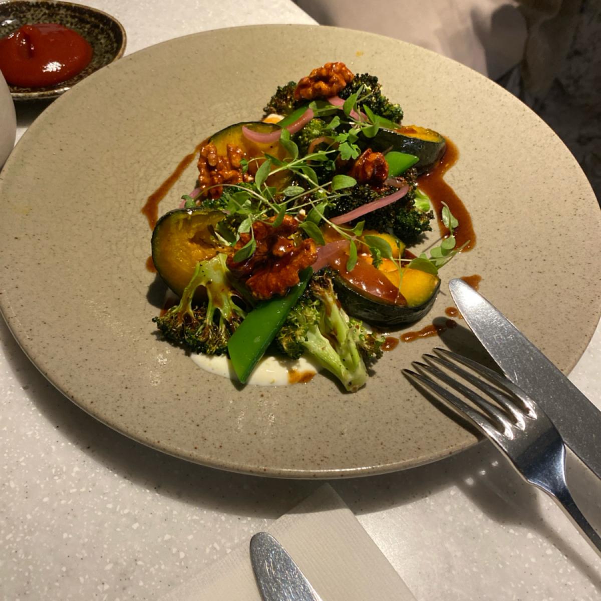 In total, we ordered three dishes and a cup of milk tea. The most amazing thing overall is the chestnut and pumpkin warm salad. The portion is not large but every bite is amazing. The broccoli and pumpkin are roasted just right, and paired with a refreshing and orange-flavored yogurt sauce. It is very suitable as an appetizer.