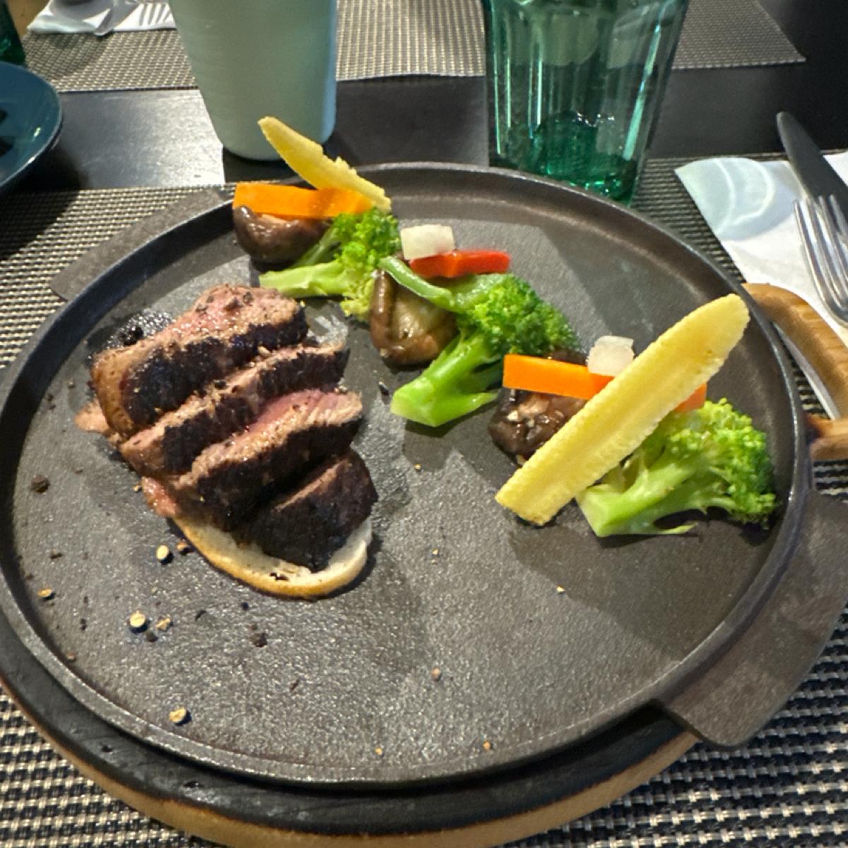 I ordered the set menu for two. The first two dishes, peeled chili noodles and seafood risotto, were delicious, but what surprised me the most was the pan-fried filet mignon. The steak was very tender.
