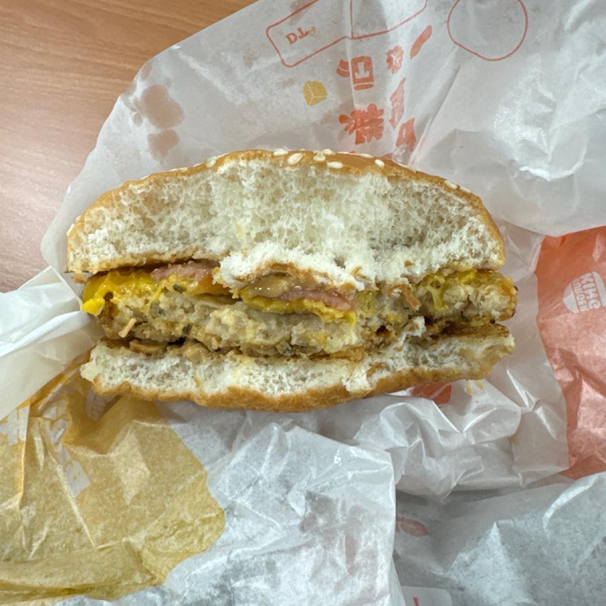 The cheese sauce is very rich. Surprisingly, there are fried garlic slices in the burger. They are crunchy and add a different texture to the burger. Hamburg steak and bacon. Normal