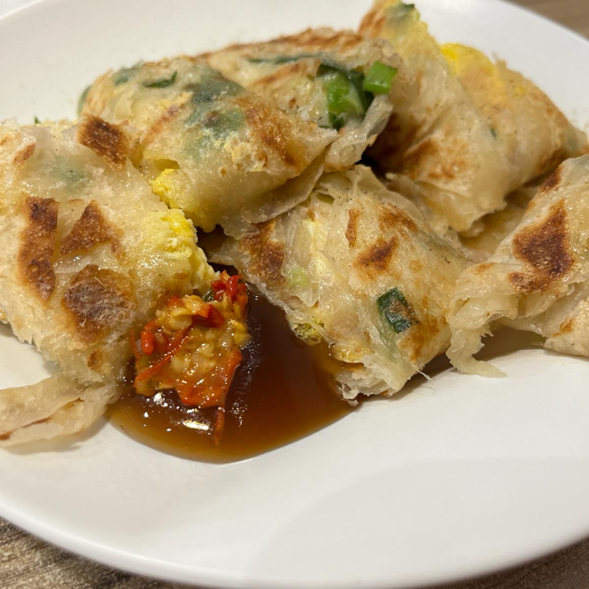 Scallion pancake with egg $50. The skin is fried very crispy, and with chili sauce, the whole meal is delicious.