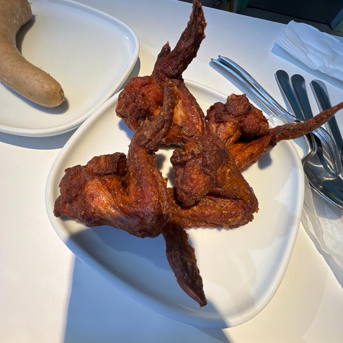 The Swedish meatballs did not disappoint; paired with a rich gravy and sweet and sour lingonberry sauce, the sweet and savory intertwining flavors are simply classic. The price isn't expensive; a portion of 15 balls is just right for two people when combined with other small dishes. This time we also ordered the fried chicken wings, which were quite well-seasoned, with a crispy skin that had a slight spiciness; however, they were a bit darker than I would prefer, with a slight oily taste, but overall the flavor was still acceptable.