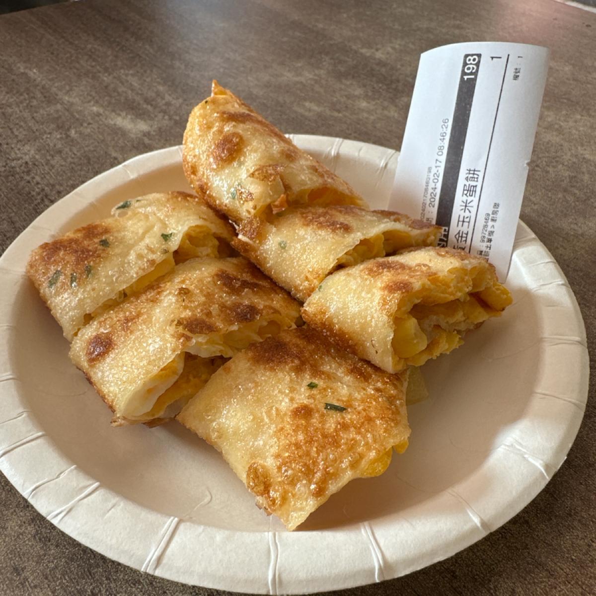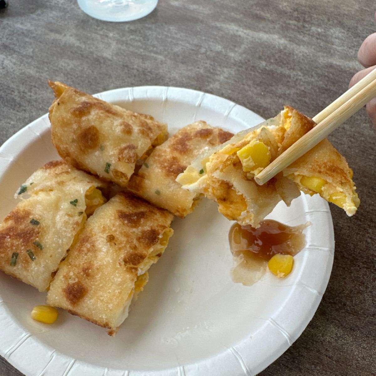 The egg pancake is fried very crispy and there is quite a lot of corn.