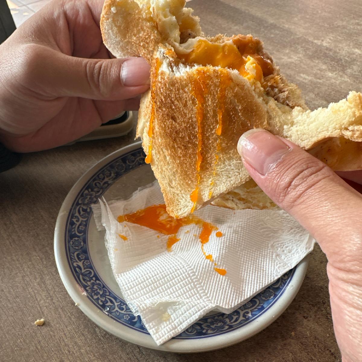 The tuna toast mixed with the popped egg yolk is very delicious