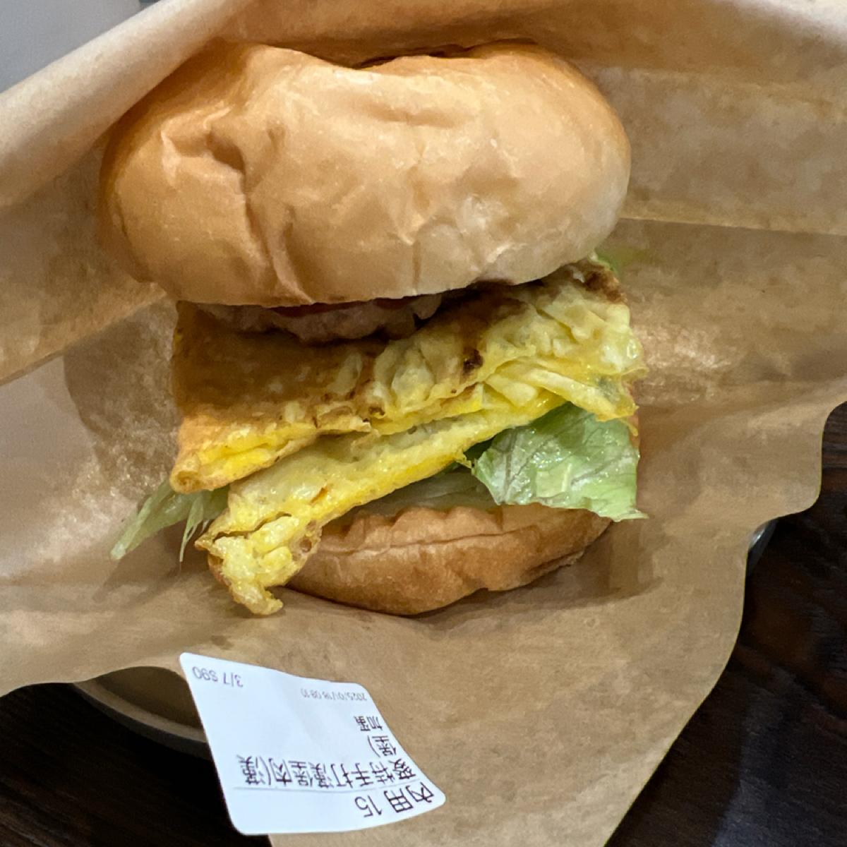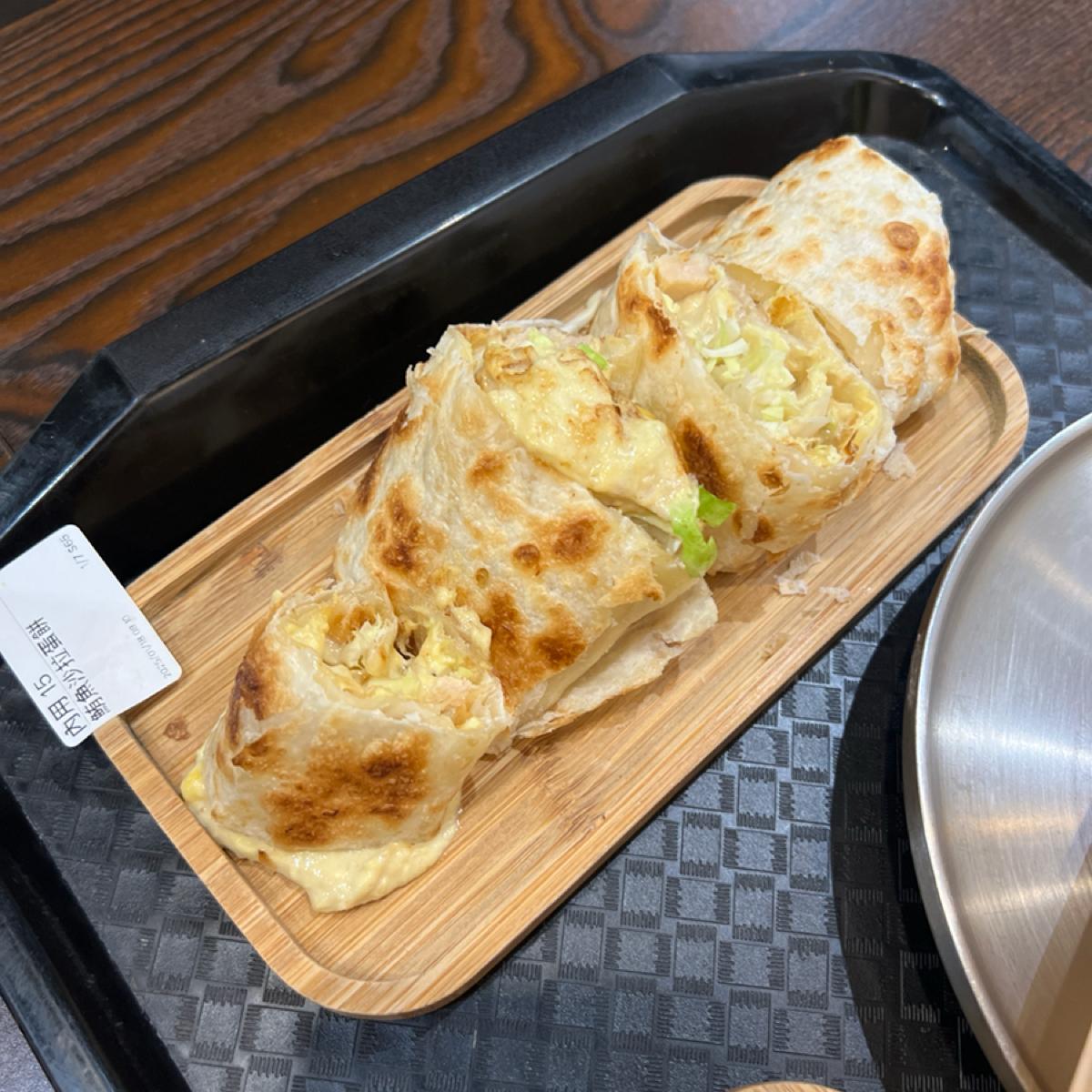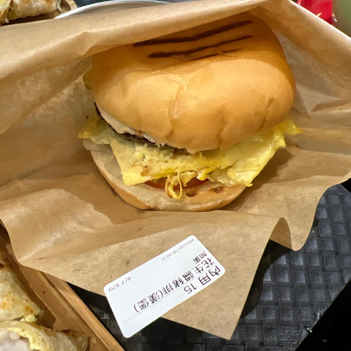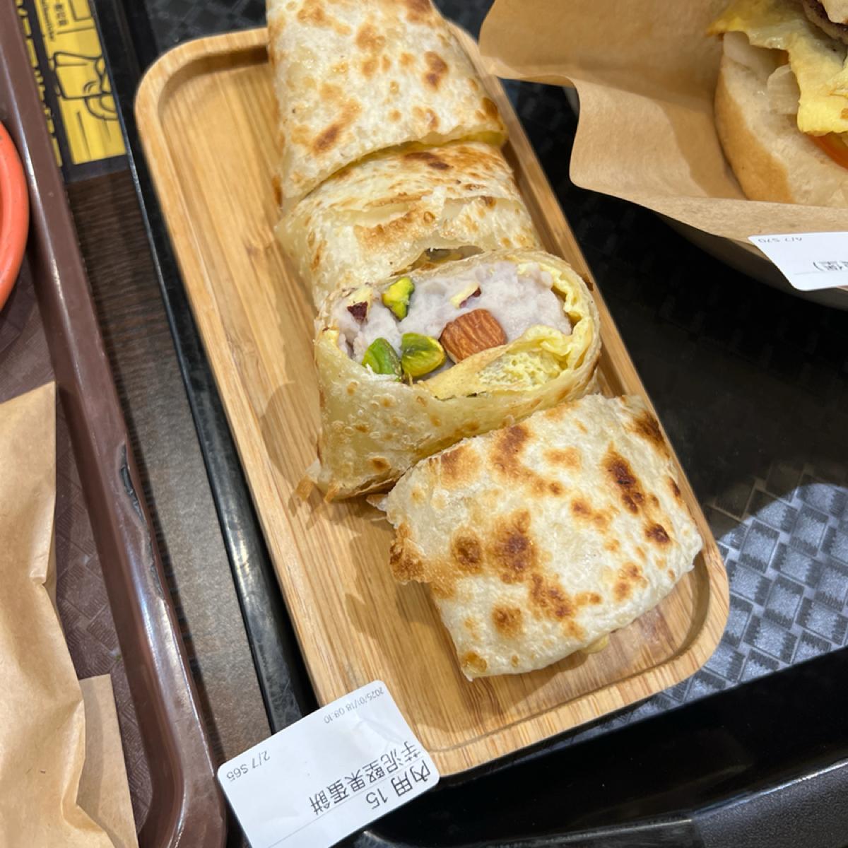 This time, I ordered a peanut butter pork chop burger with an egg (70 NT), peanut toast (30 NT), tuna salad egg pancake (65 NT), taro nut egg pancake (65 NT), a homemade burger patty burger with an egg (90 NT), three-cup braised pork mini buns, a hash brown, a latte, and unsweetened soy milk. The filling of the tuna salad egg pancake is quite rich, and the seasoning is different from the usual tuna egg pancakes, making it enjoyable rather than monotonous. The sweetness of the taro nut egg pancake is moderate and not overly cloying, complemented by the rich texture of the nuts. The homemade burger patty burger is juicy, and the bun is of decent quality.