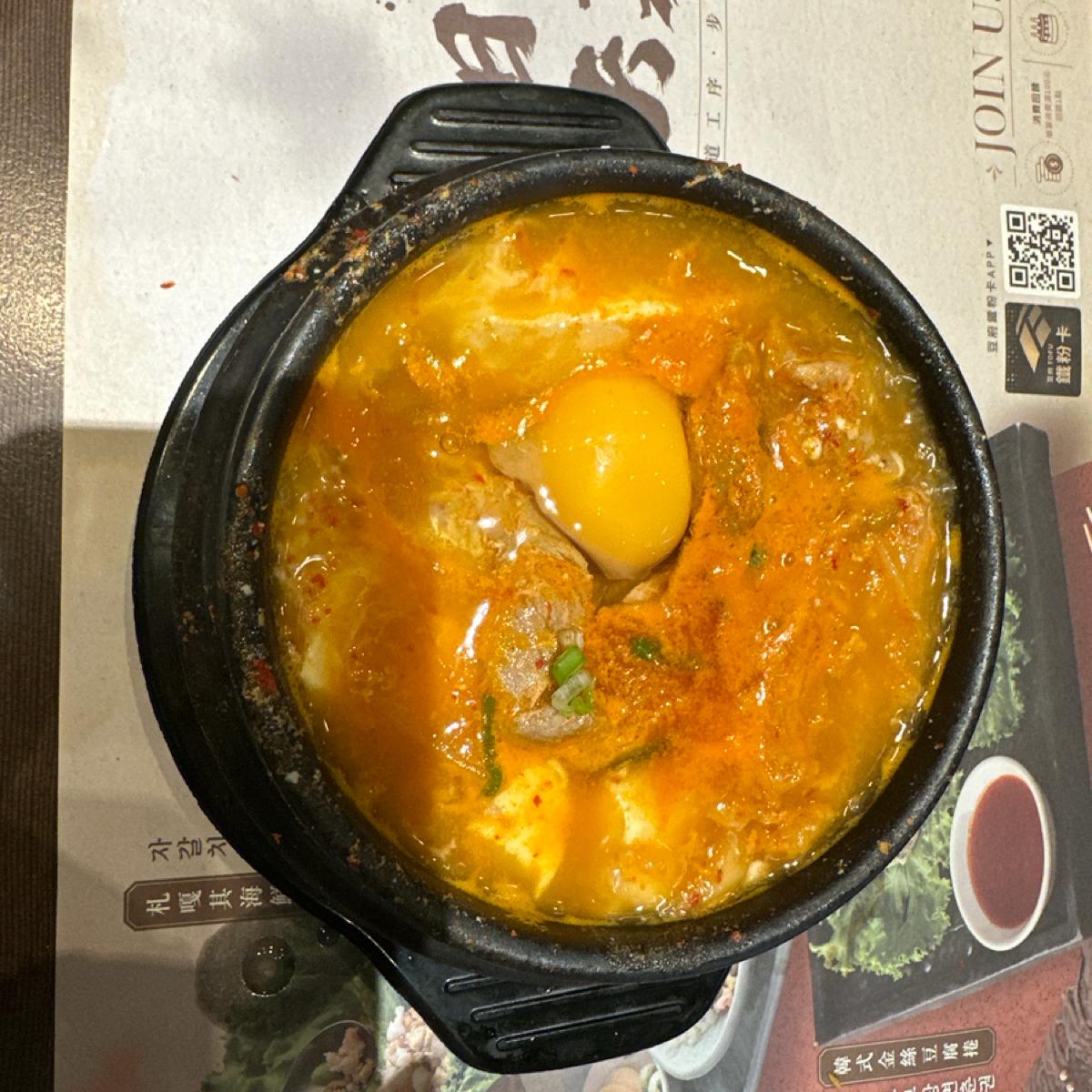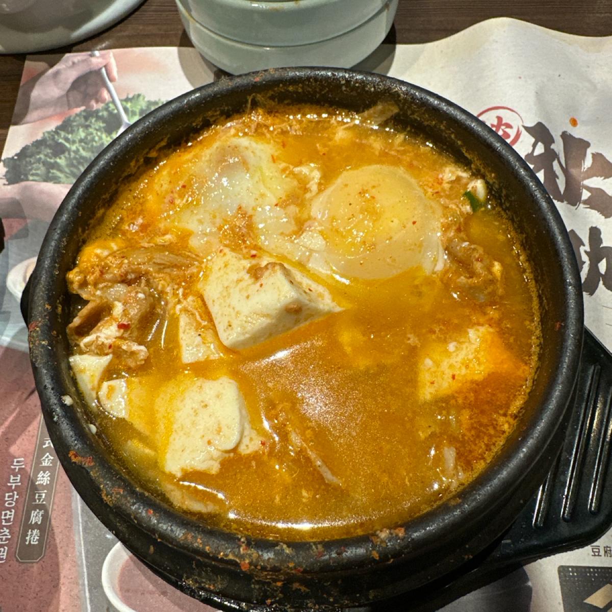 The meal is kimchi soft tofu hot pot, pork (optional beef, lamb, pig, dumplings), all orders come with crispy rice and unlimited side dishes, there is also a dessert after the meal, and barley tea is provided on site