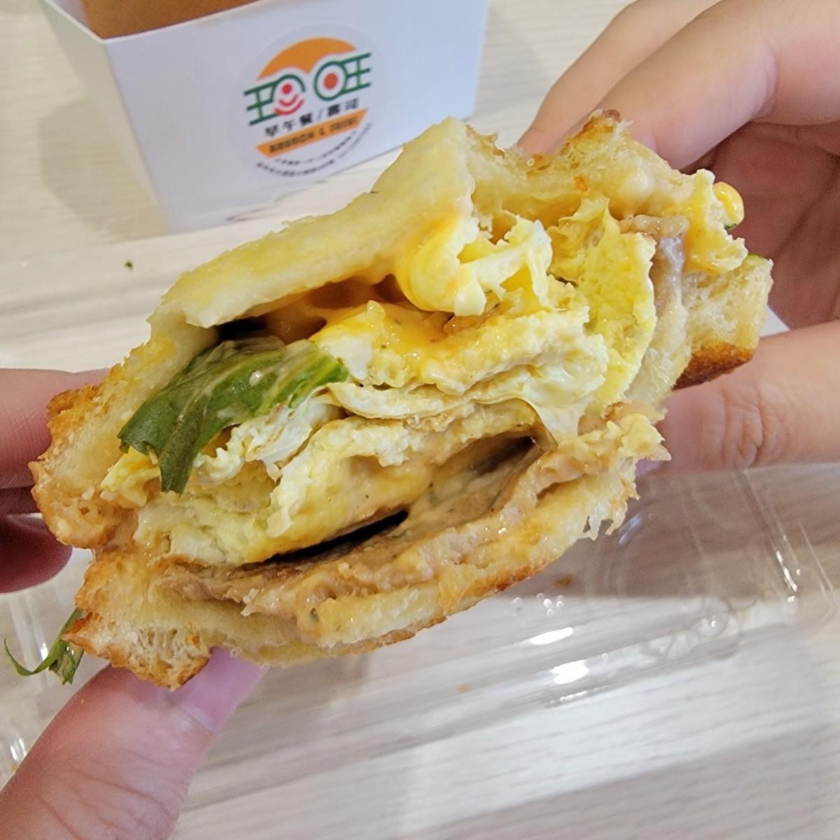 The layered toast with bacon and egg is very tasty. I heard that the layers are made with a lot of oil, which you can't really taste; there's a piece of vegetable inside, and the omelet is quite thick along with another piece of vegetable and a pink unknown sauce. The meat slices are the same as those in regular bacon and egg toast, just thin slices.