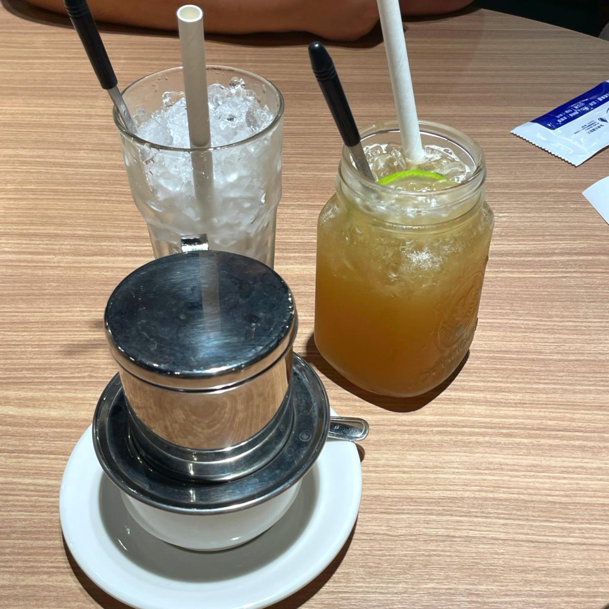 I was also curious about the Vietnamese coffee, made with a special drip filter with condensed milk at the bottom. After stirring, you pour it out and enjoy. I didn’t taste anything particularly special; it just tasted like a latte with sugar. I'm not really used to it and it doesn’t pair well with the dishes, but it was nice to try once! It might be better to order it after the meal.