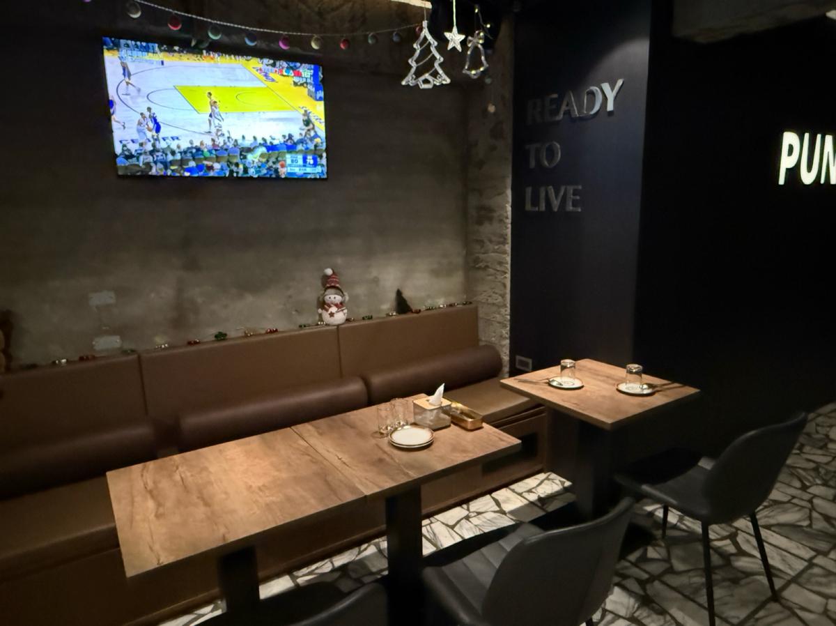 This bistro, PUNCH OUT, literally means "clock out," and inside, there's seating on the first floor as well as a large private room in the basement. The overall space is very spacious, and there are TVs mounted on the walls broadcasting sports events at all times, making it a perfect spot for friends to drink and watch various sports games.