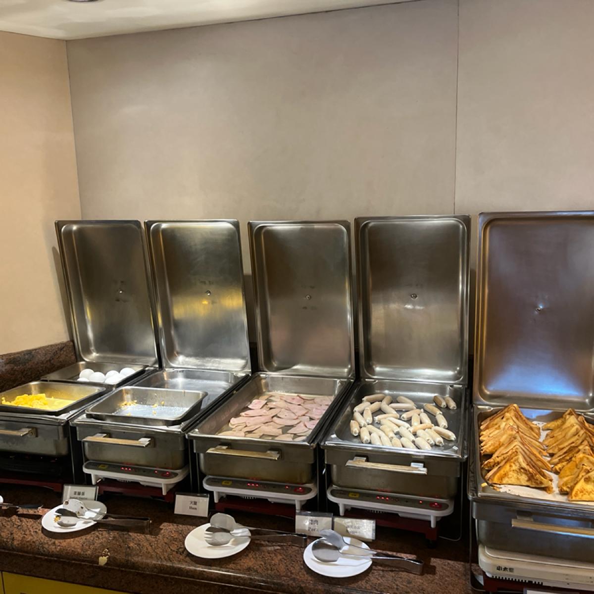 The breakfast on the upper floor is mainly buffet-style. Although the selection is not as extravagant as large five-star hotels, it offers a complete range of basic Chinese and Western dishes. The Chinese section includes porridge and side dishes like peanuts and gluten, which have a standard flavor. The Western portion offers toast, scrambled eggs, bacon, and sausages, alongside juice, milk, and coffee—simple yet adequate.