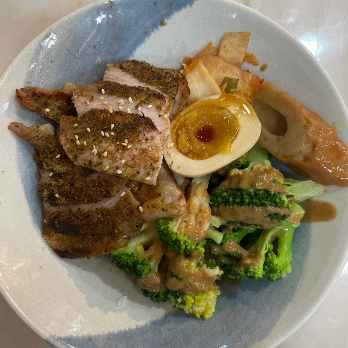 The side dishes for donburi are terrible... Today's side dishes are sesame broccoli, kimchi, bamboo shoots, and half a soft-boiled egg. Except for the soft-boiled egg, which is OK, the other side dishes are not very good.
