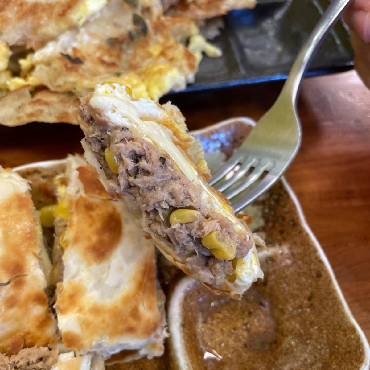It's a puff pastry egg pancake with a very crispy texture. The tuna inside is just moist, and there's cheese in it that melts a little after being heated. It's delicious.