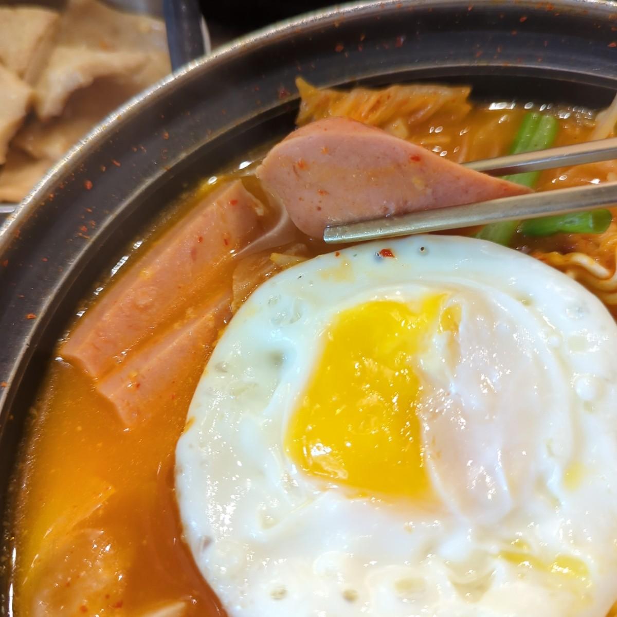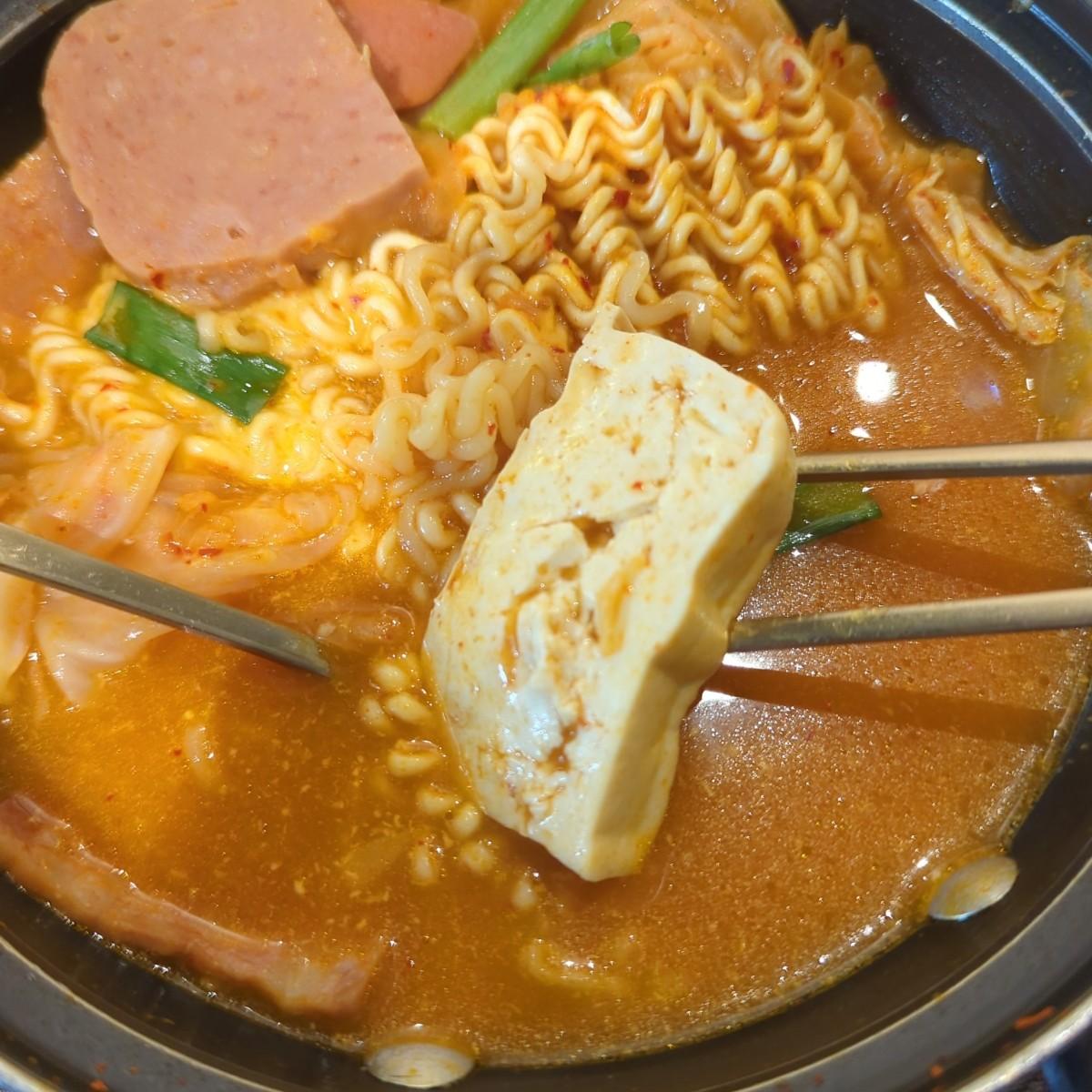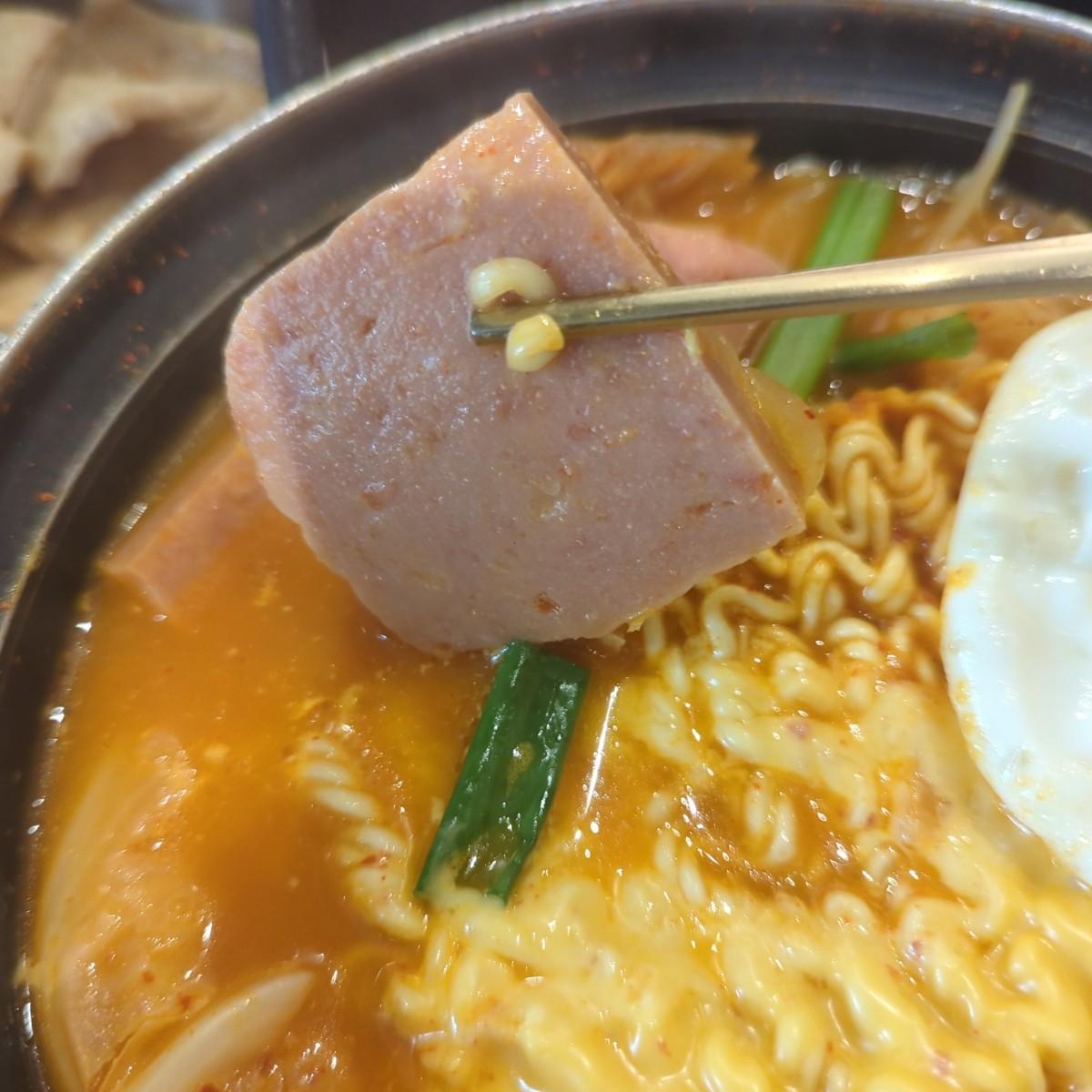 This set meal comes with 3 side dishes, namely kimchi, fish board, shredded kelp, a bowl of white rice and army pot. Among the side dishes, the first place is kimchi, which is crispy, not too sour and a little sweet; the fish plate is second place, mainly because it has a bit of fishy smell (later I threw it all into the pot and heated it up and it was great); and finally, the shredded kelp It was super unpalatable 😂😂 There was no seasoning on that one, so I ended up throwing it into the pot before finishing it.