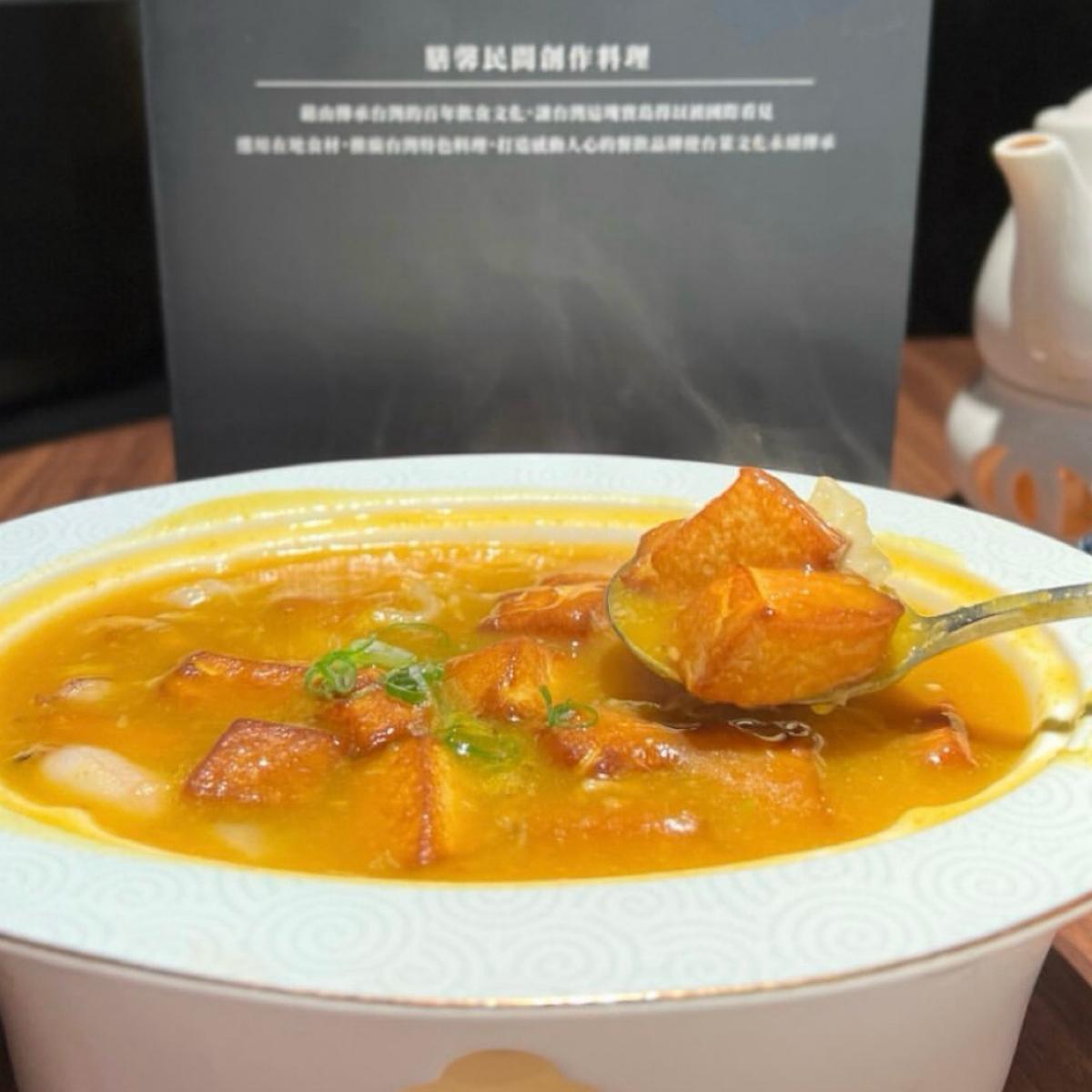 Crab roe and pumpkin puree cooked with fish maw, crab meat and tofu