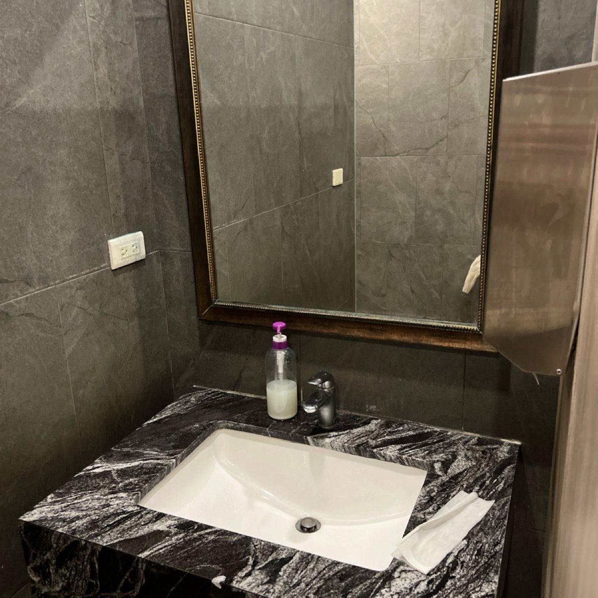 User review: The restroom is quite spacious, but the sink area is a bit small.