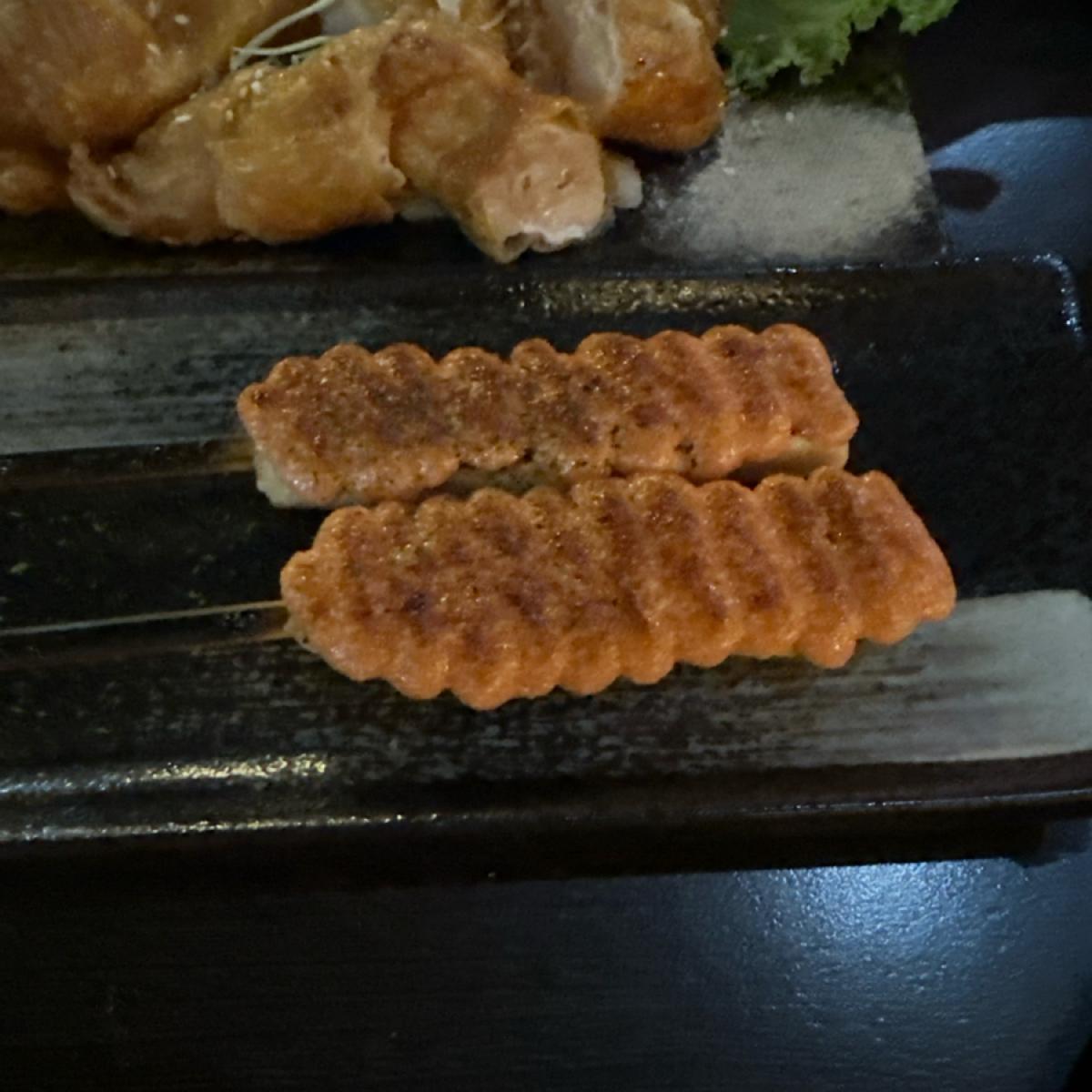 The chicken is stuffed into pig casings and then grilled. It's crispy on the outside and soft on the inside, and still retains the chicken juice. It's very delicious.