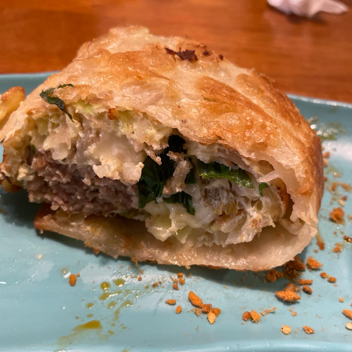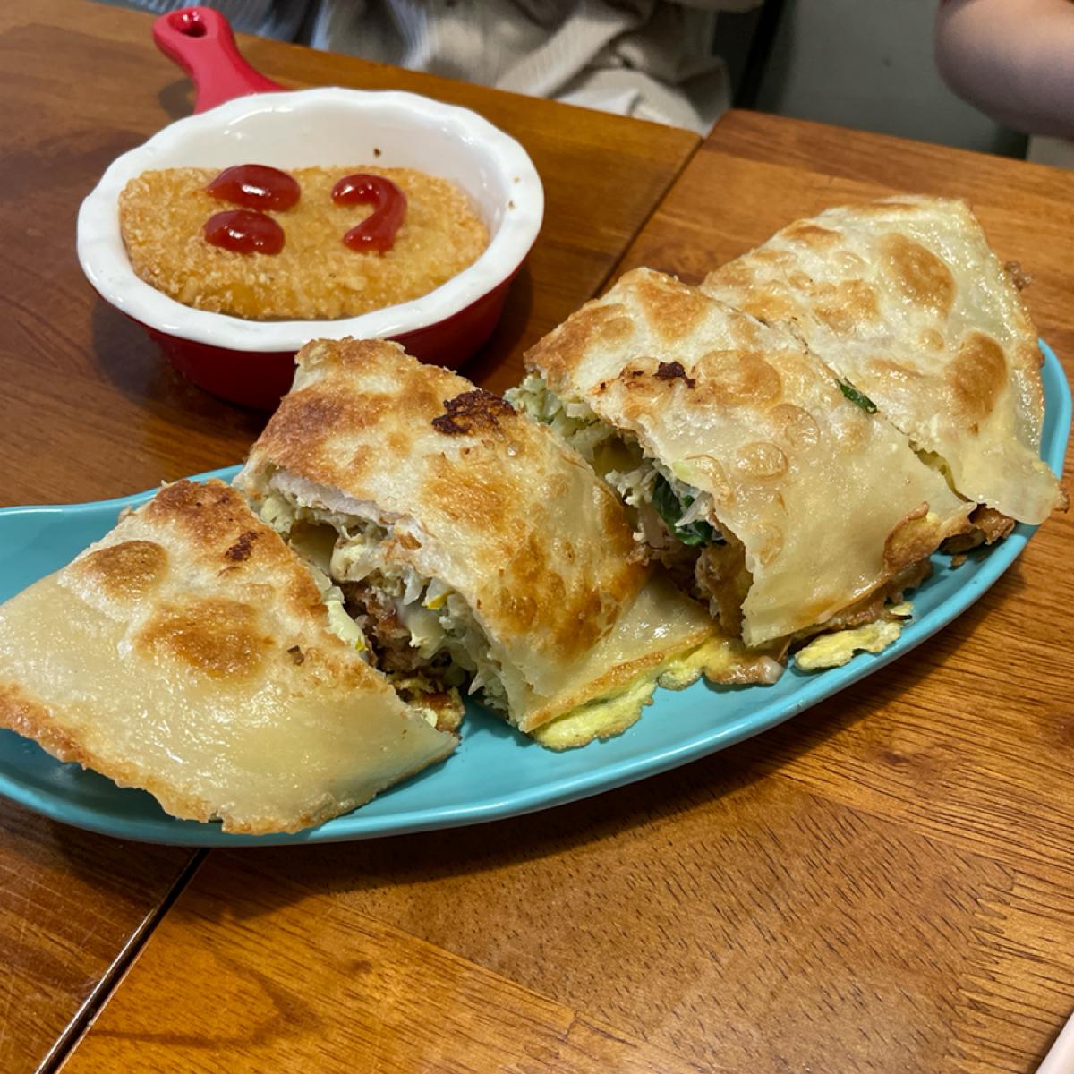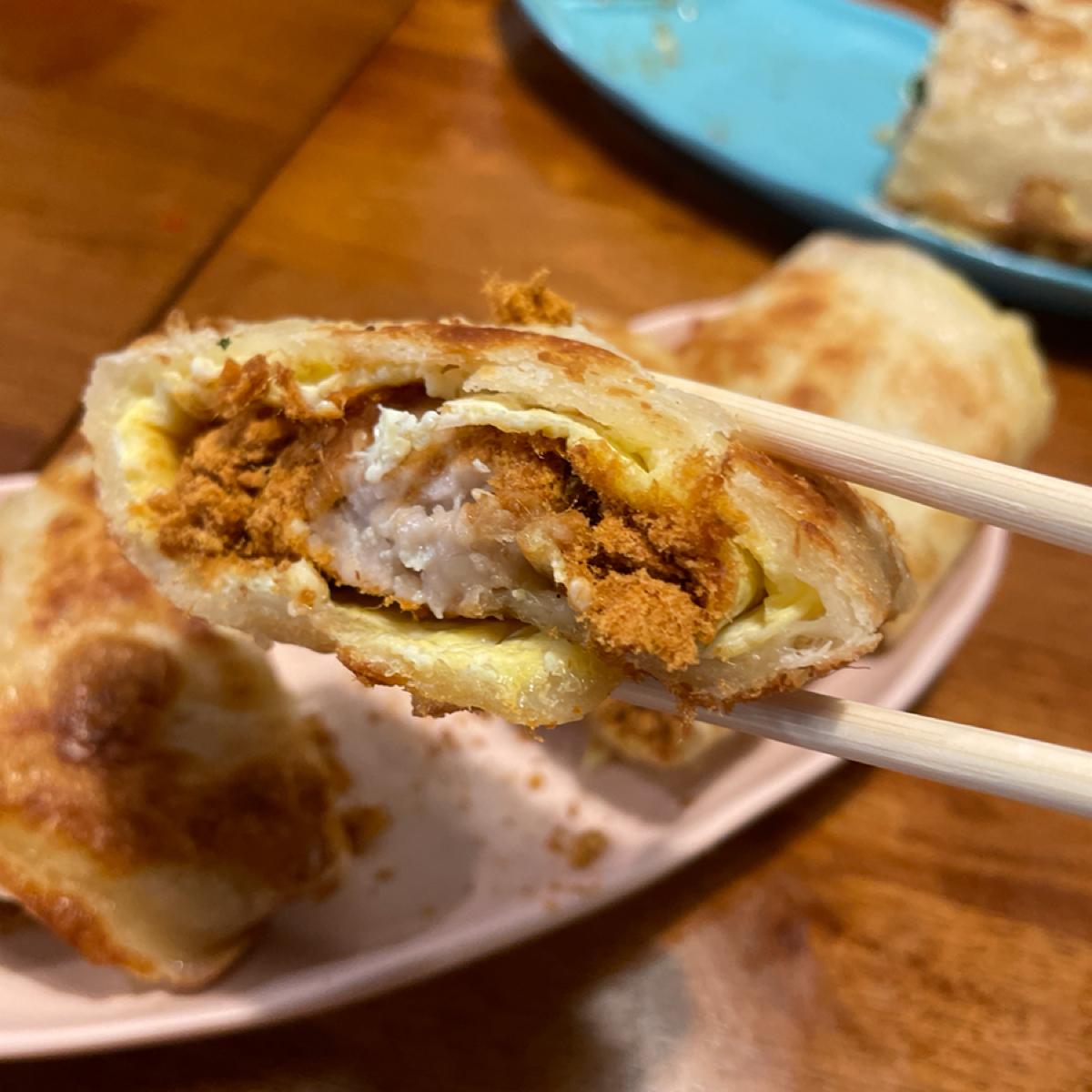 The egg pancake is of a crispy style. If you want a traditional soft egg pancake, you'll need to go to another place! We chose meat floss with taro puree, cumin pork with cheese + cabbage, and shared among three of us because I wasn't very hungry. Usually, it’s best for each person to have one or else you won’t feel full! I liked both flavors quite a bit! The dipping sauce is not your ordinary soy sauce; it is the shop’s special recipe with some spice, which is quite good.