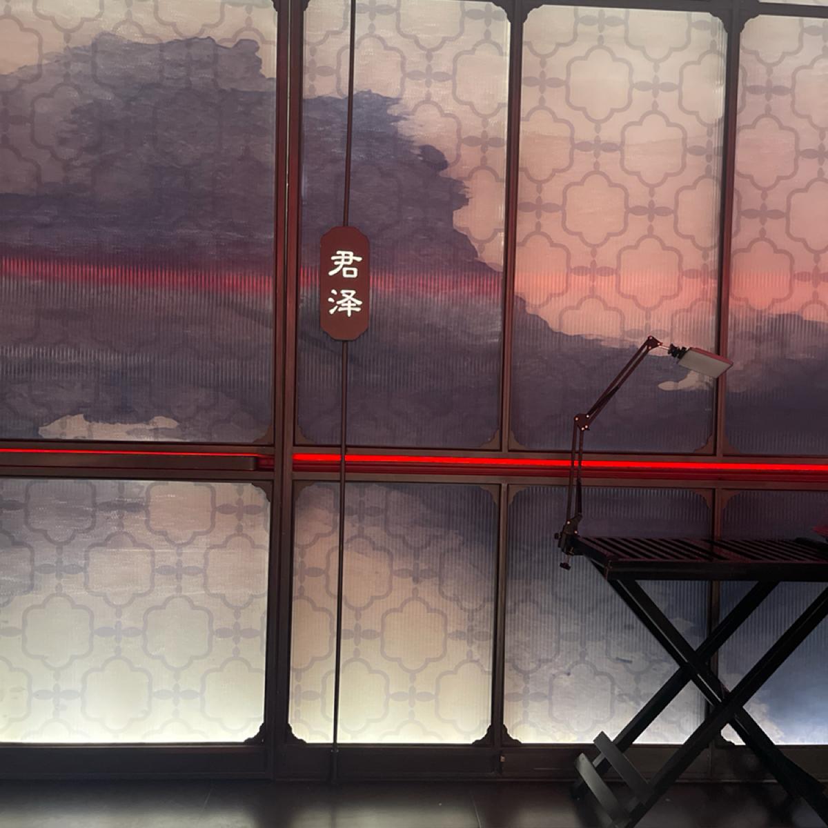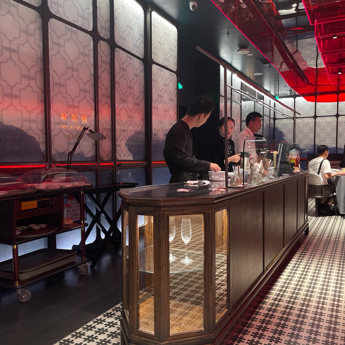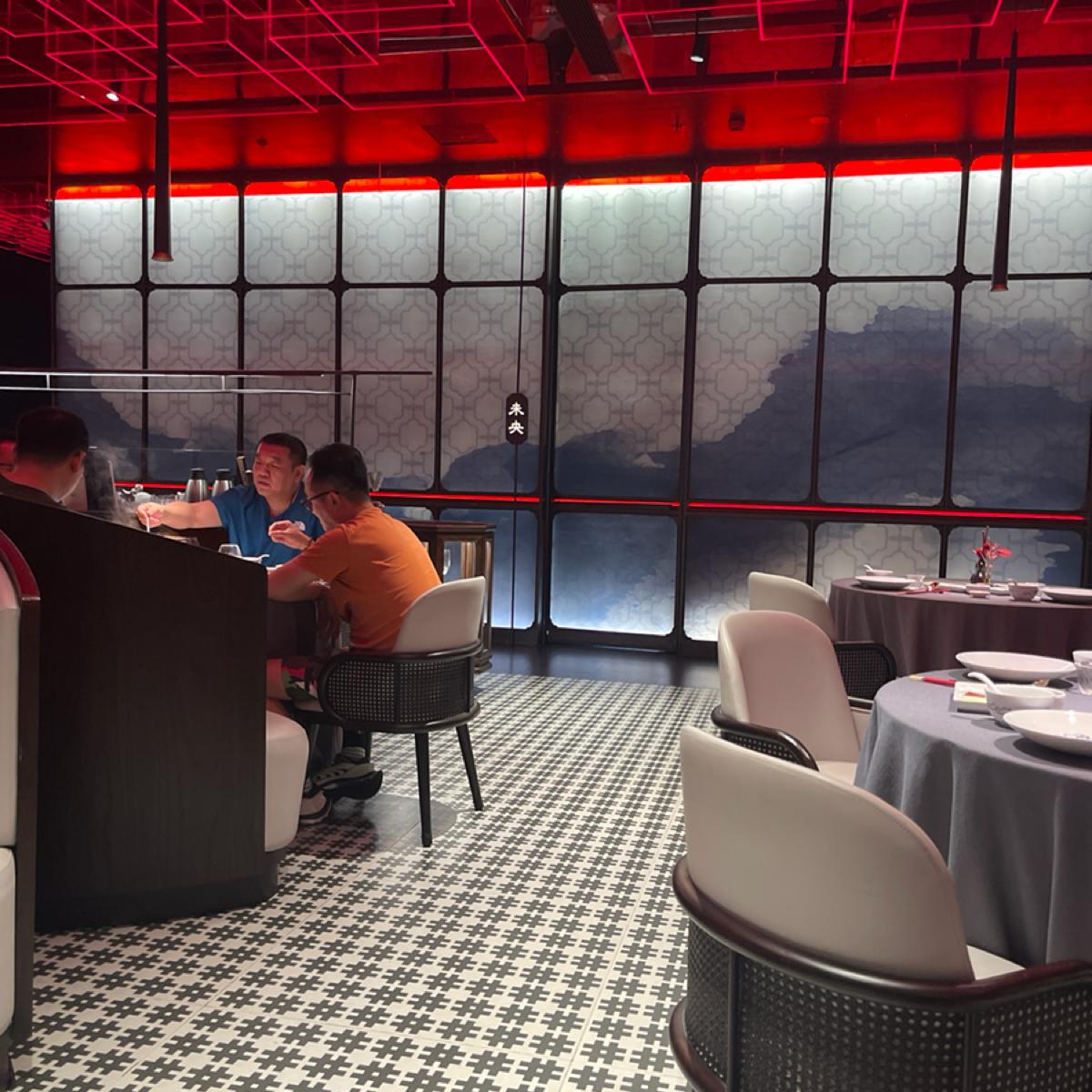 The restaurant's color scheme of black and red is elegant yet dignified.