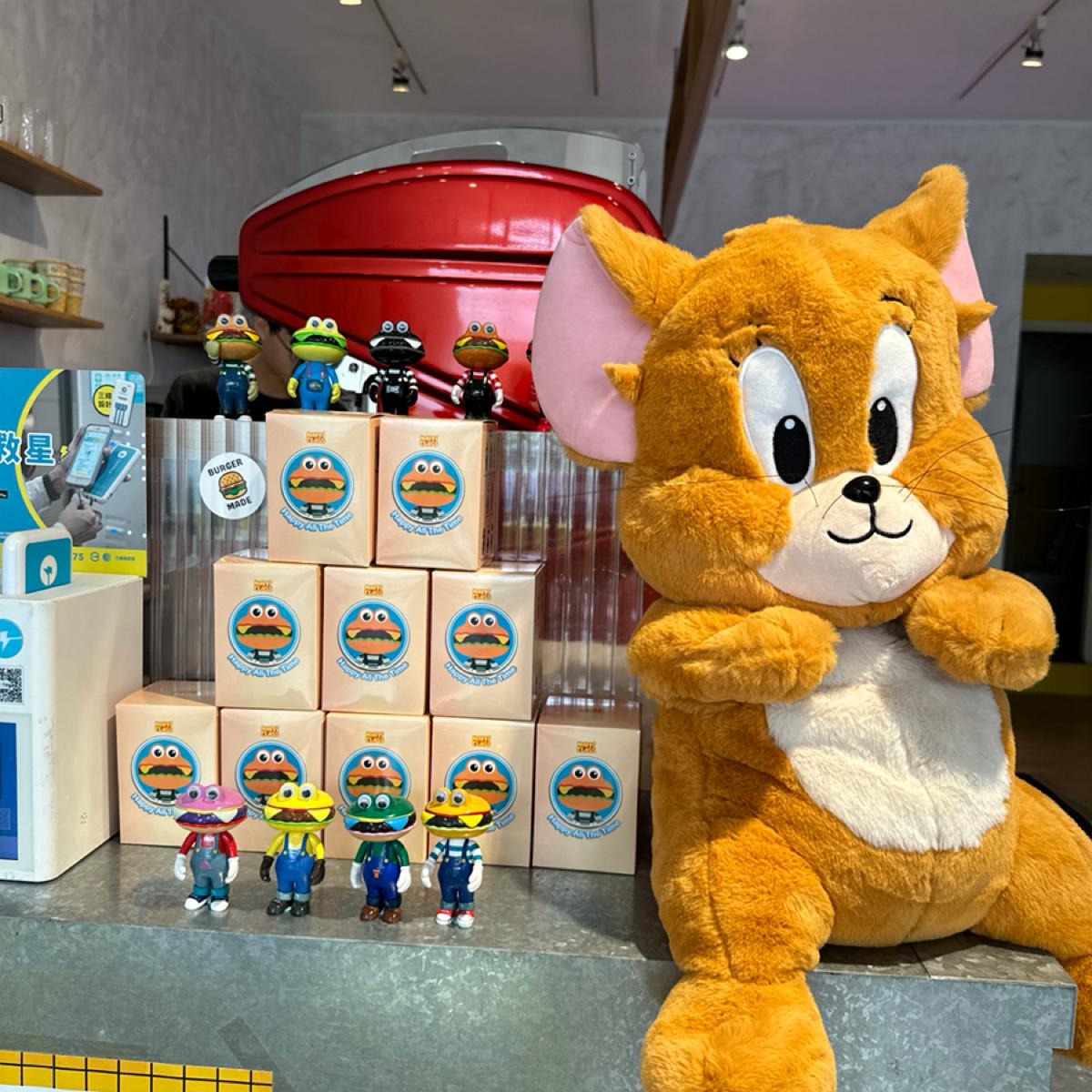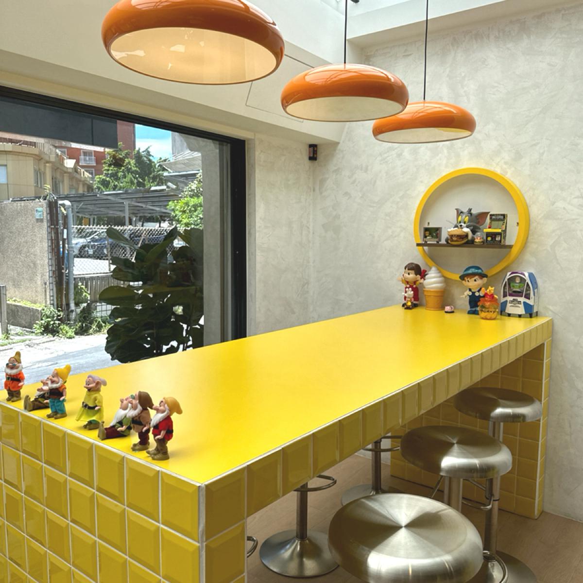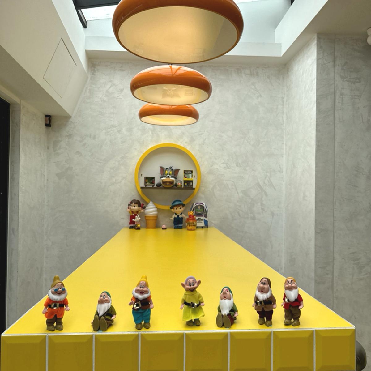 I also really like the row of large yellow island seats; you can see that vibrant yellow from outside the shop. There are a lot of retro cartoon figurines on the tables, like dwarfs, Tom and Jerry, and characters from the Fujiko F. Fujio series. Plus, there's transparent glass overhead, allowing plenty of natural light in, which uplifts the mood!