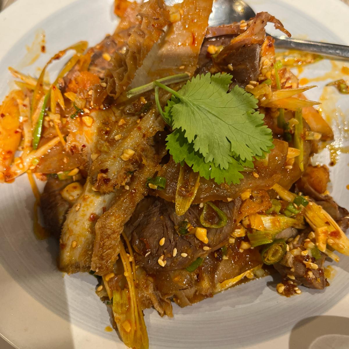 The braised beef tripe performs steadily, with a chewy yet tender texture; the braising sauce has a mild aroma, not overly salty or spicy, making it very palatable and perfect to pair with white rice. The mouthwatering chicken stands out as a relatively distinctive item among the dishes; its numbing and spiciness have been refined, so it’s not overly stimulating, but the aroma remains. The chicken itself is not dry, and the sauce pairs well with rice.