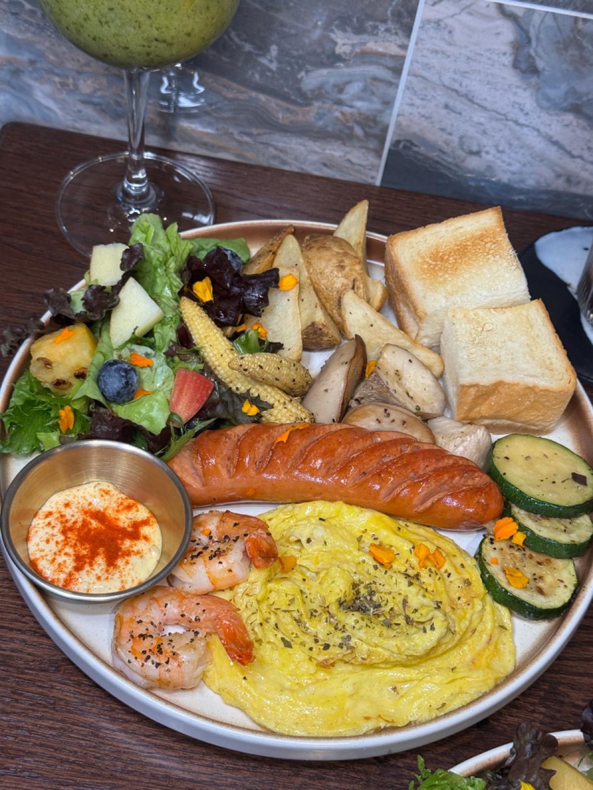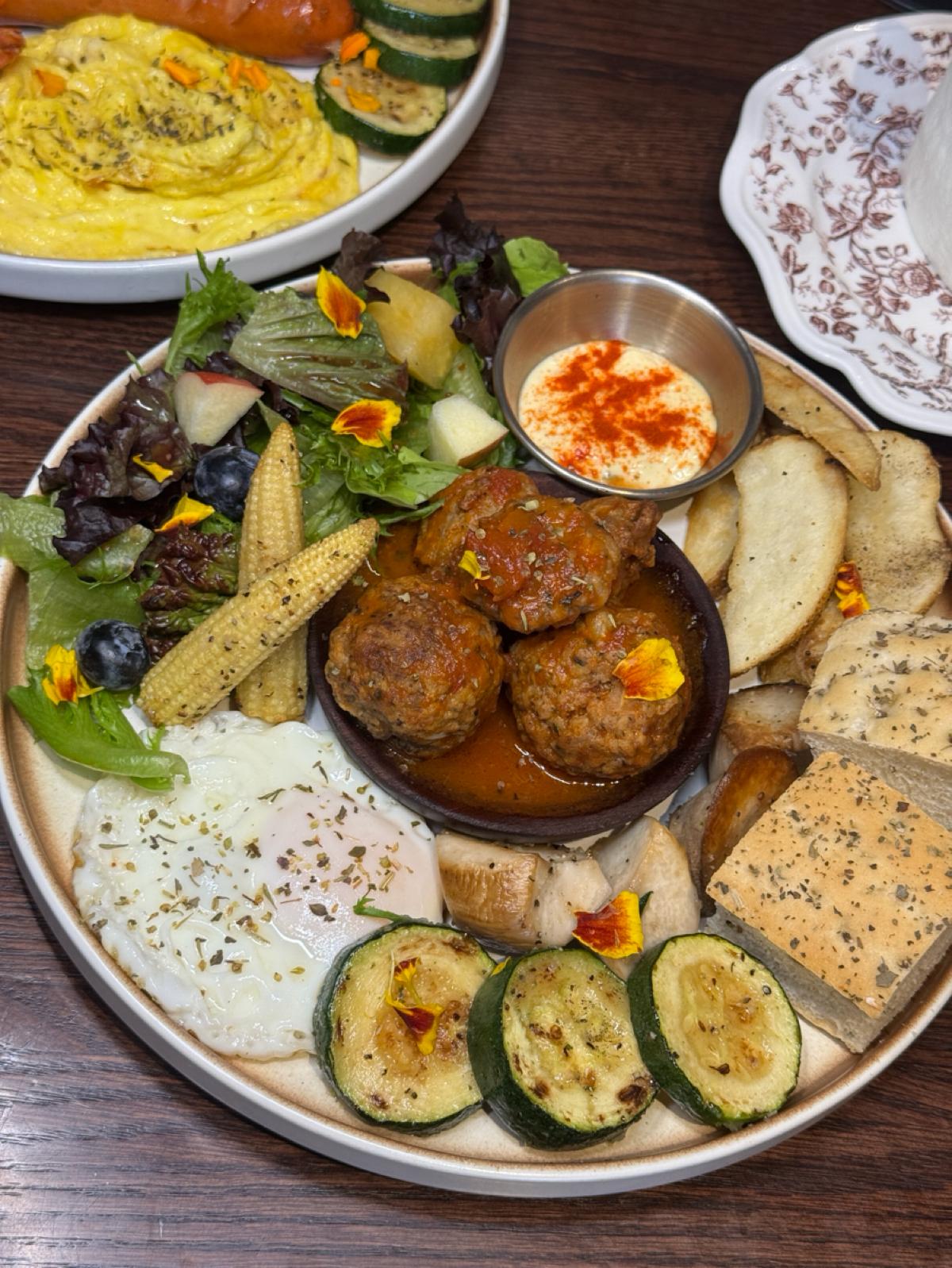 Their brunch platter is only 270 NT dollars, and the portion is huge and substantial, plus it’s really delicious. The platter includes a main dish, bread, salad, and vegetables, and after finishing it, you'll definitely feel full, while also enjoying a healthy and refreshing meal.