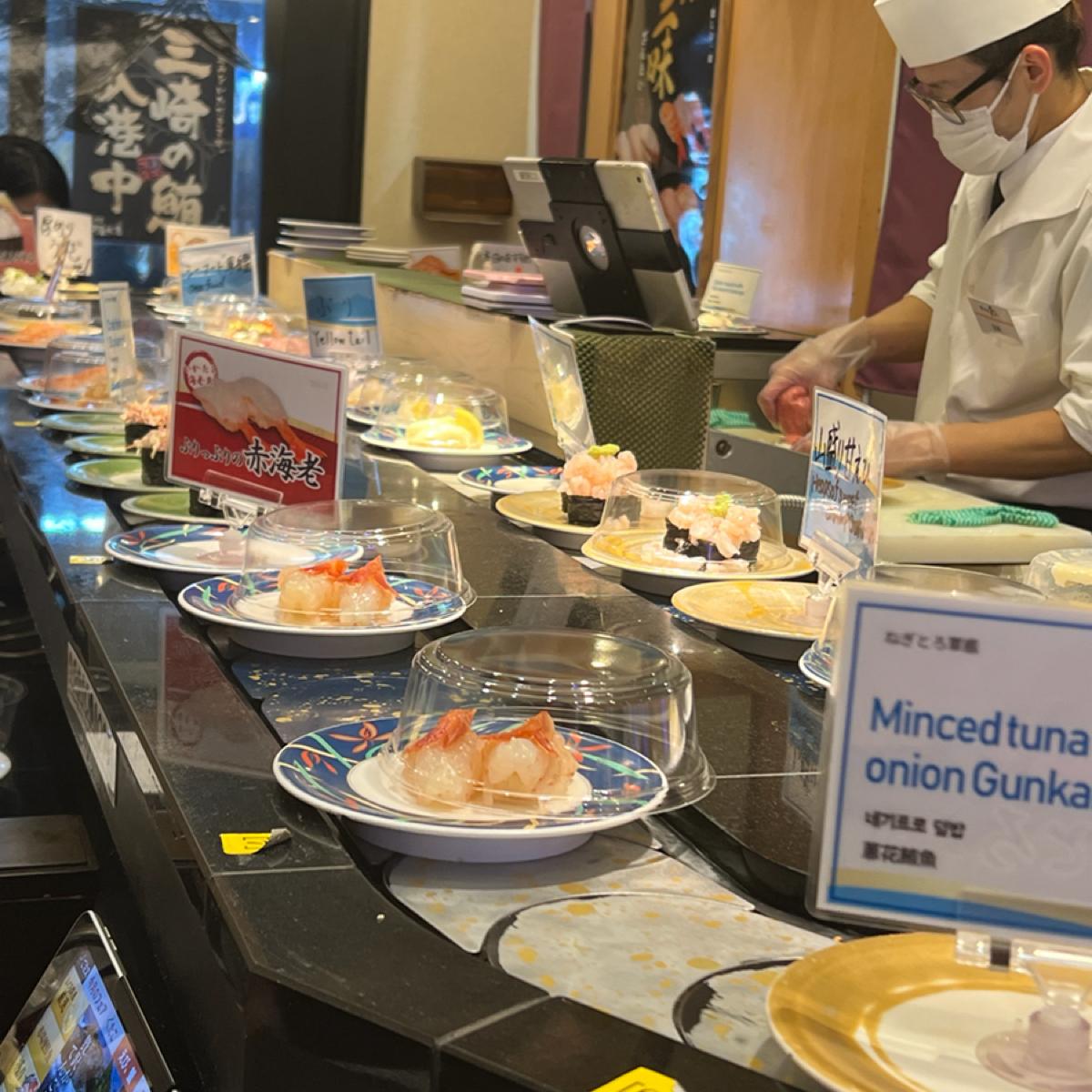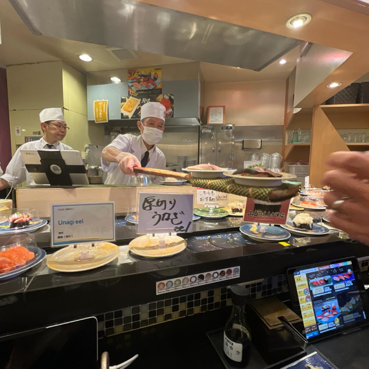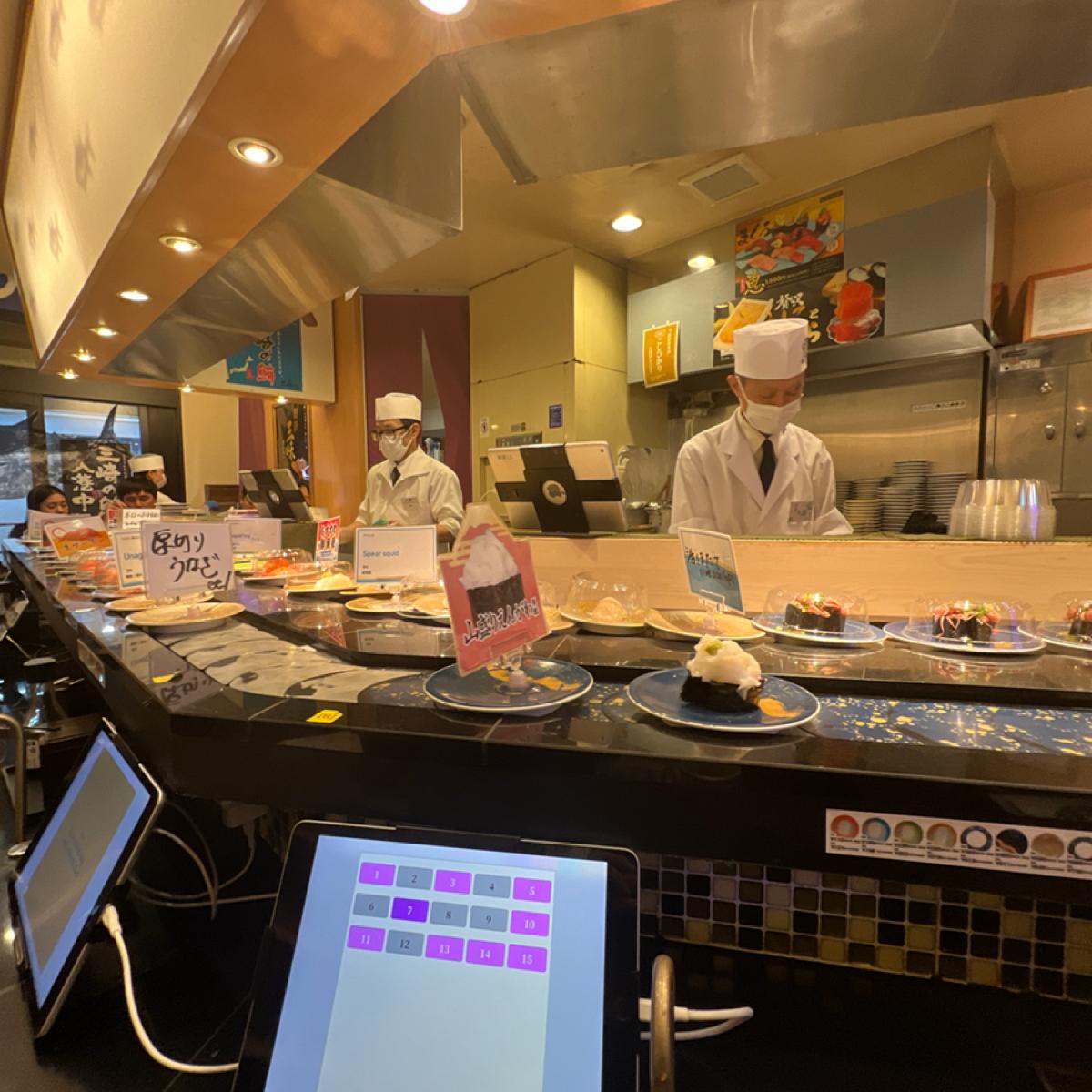 A revolving sushi restaurant that started in Yokohama, the storefront is small and packed with customers. The chefs are seasoned veterans, quick and skillful. The environment is bright and clean, but a bit cramped.