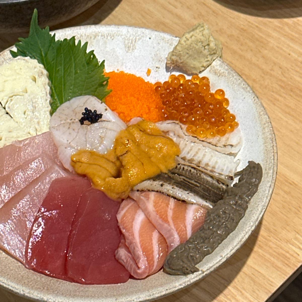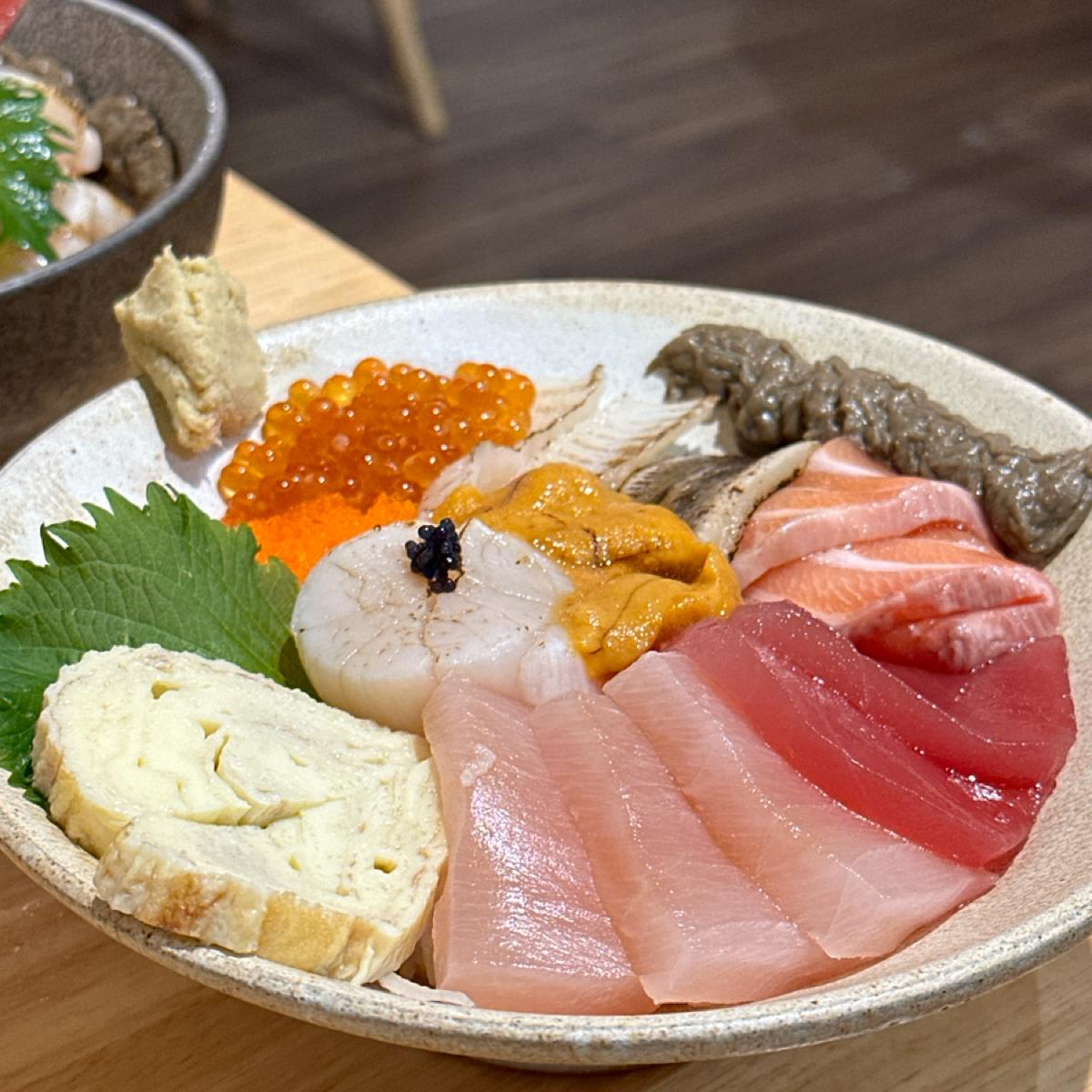 Sea urchin, scallops, grilled salmon, raw flower branches, raw scallops, halibut, crab paste, yuzu-flavored salmon roe, shrimp roe, chopped green onion