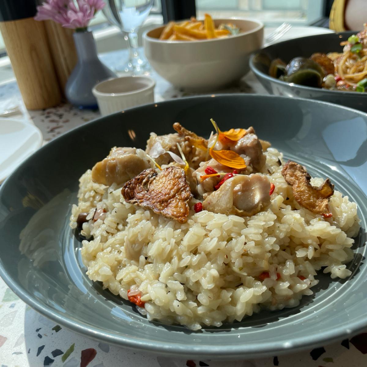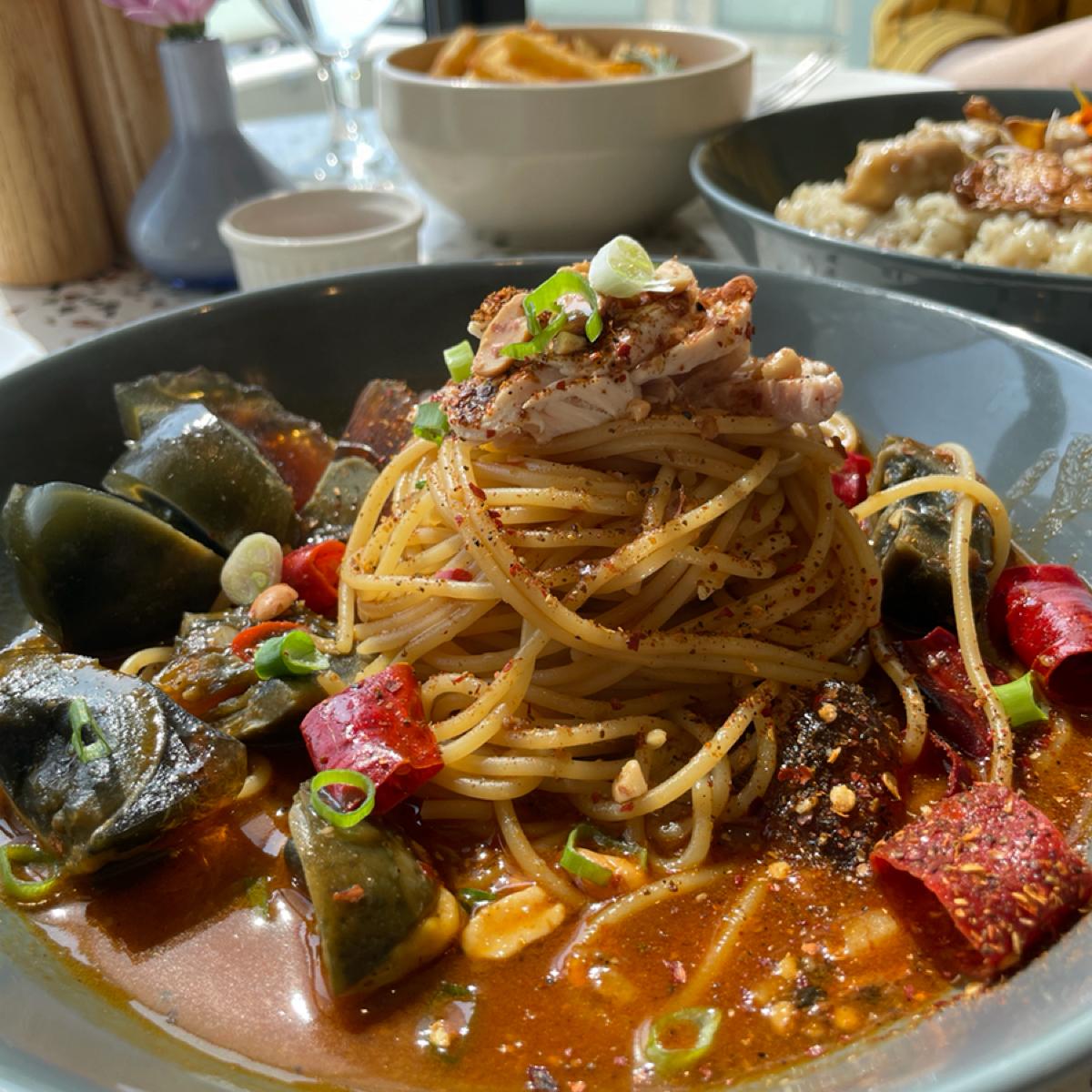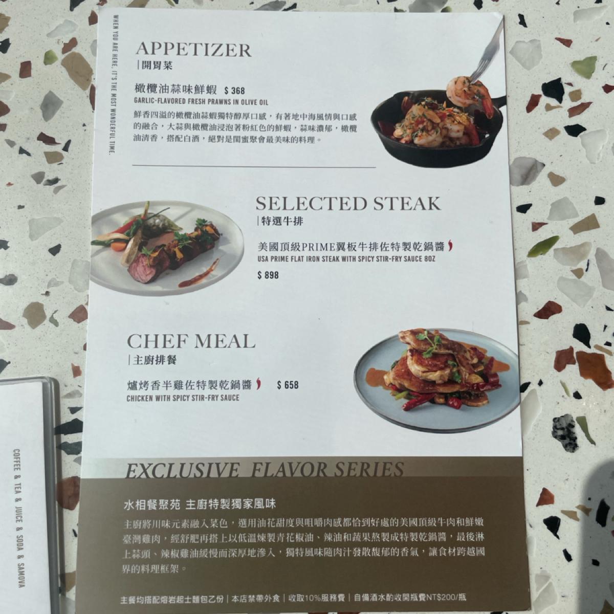The Shuixiang Dining Garden, which looks like a white building, has an elegant and comfortable dining environment, suitable for best friends or young couples to come together for a date. This time, I chose black sesame oil chicken risotto and Sichuan spicy marinated chicken and preserved egg pasta for main meals. Both of these dishes are relatively rare on the market. The portions are sufficient and the flavor is rich and rich, which is very amazing.