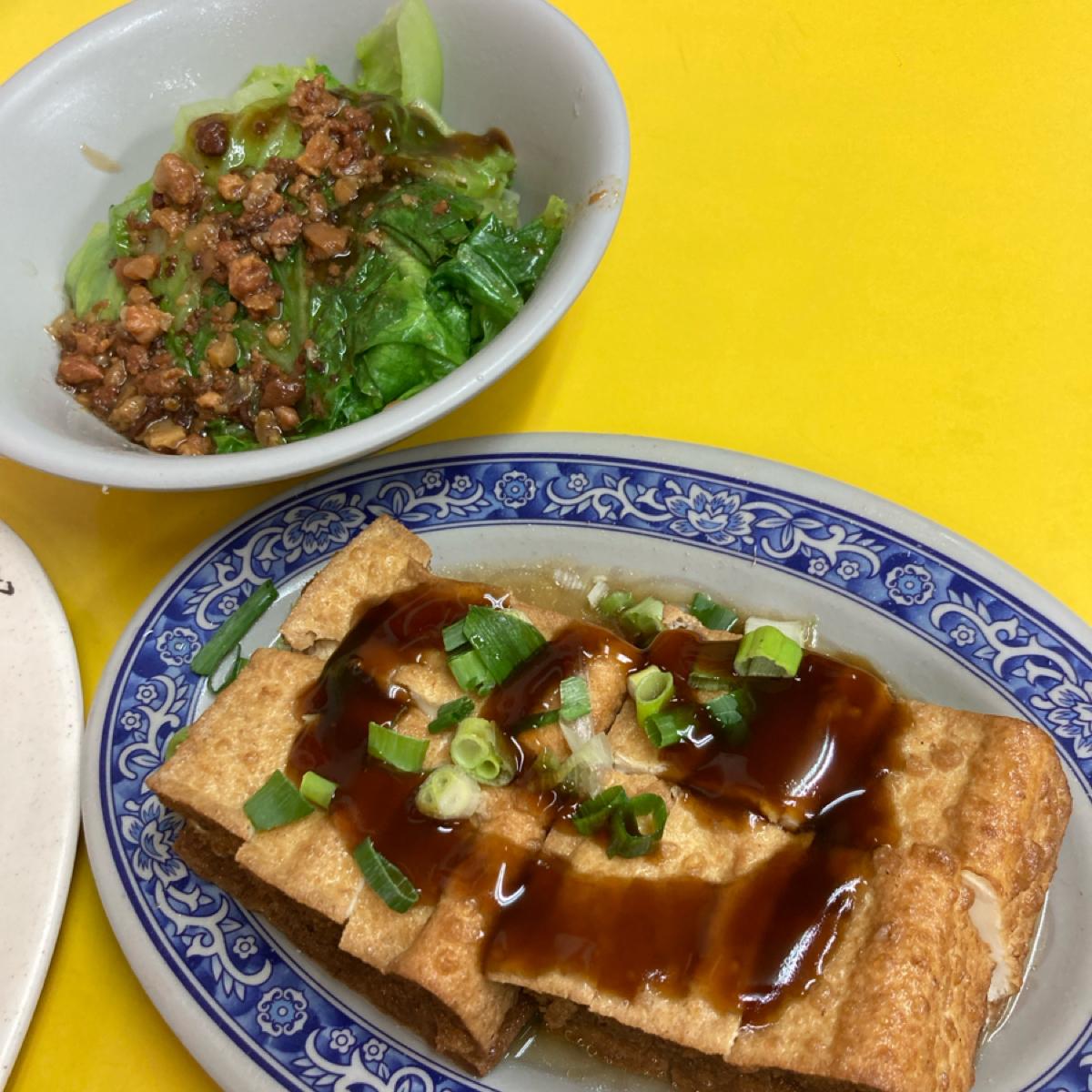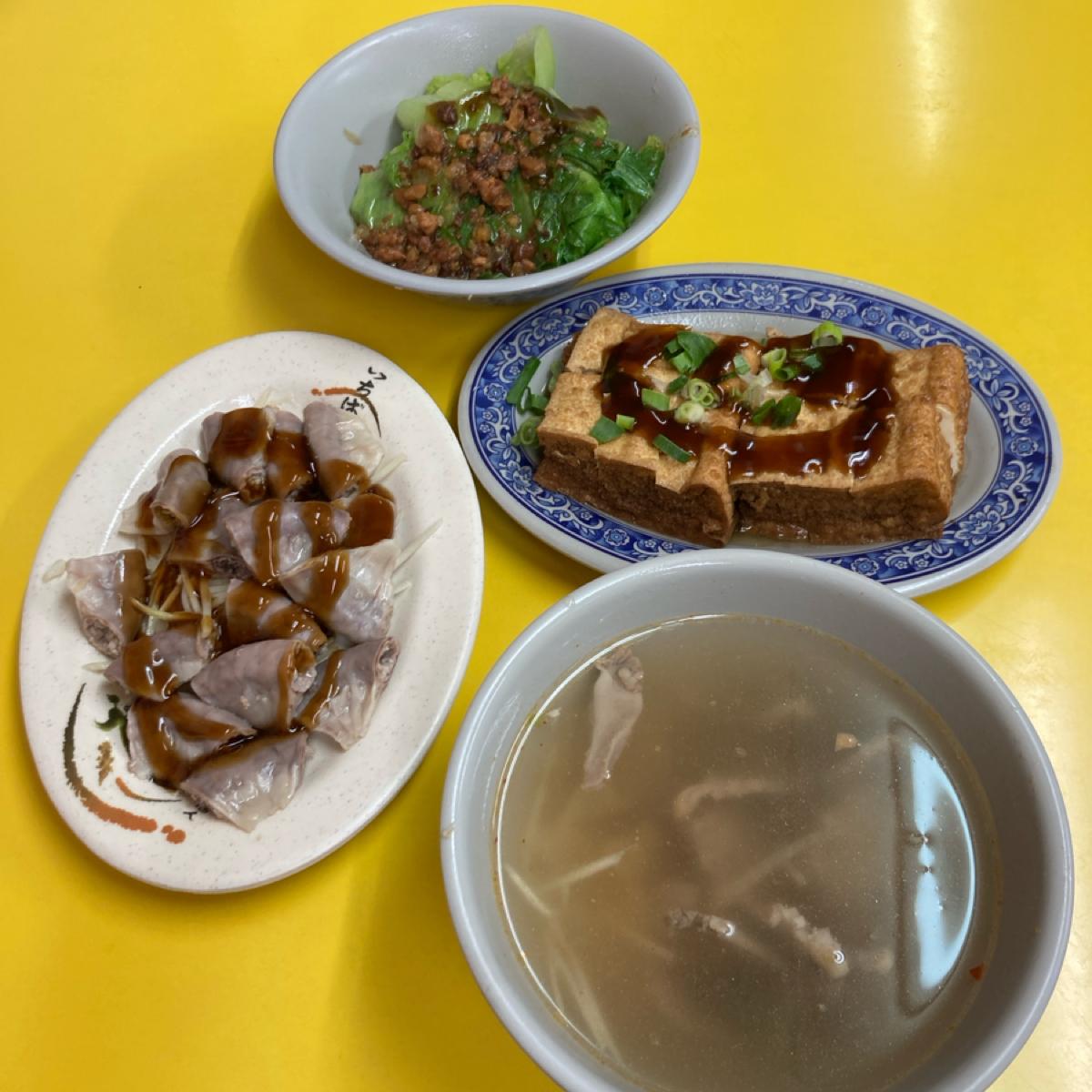 It's a pretty good snack shop. It was my first time eating there, and I ordered liver noodle soup, pig intestine, boiled vegetables, and fried tofu.