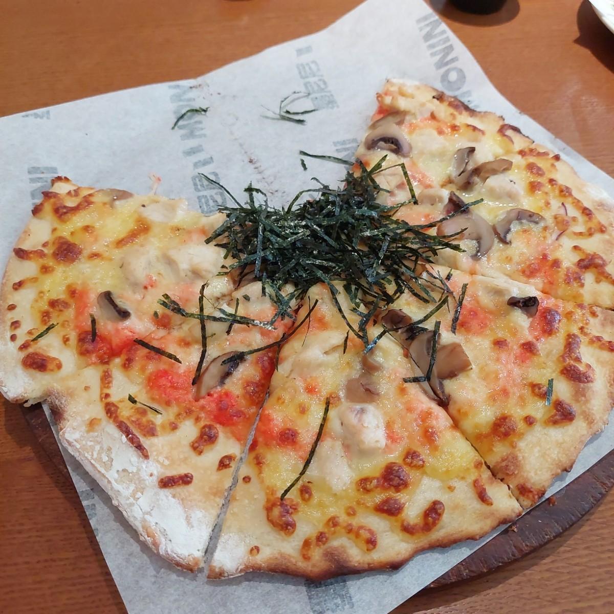 The pizza is thin and tastes good (mentaiko chicken pizza)
