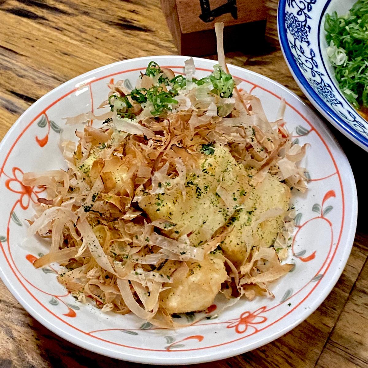 The fried tofu is crispy on the outside and soft on the inside, served hot! It’s delicious and refreshing when dipped in sesame sauce along with bonito flakes!