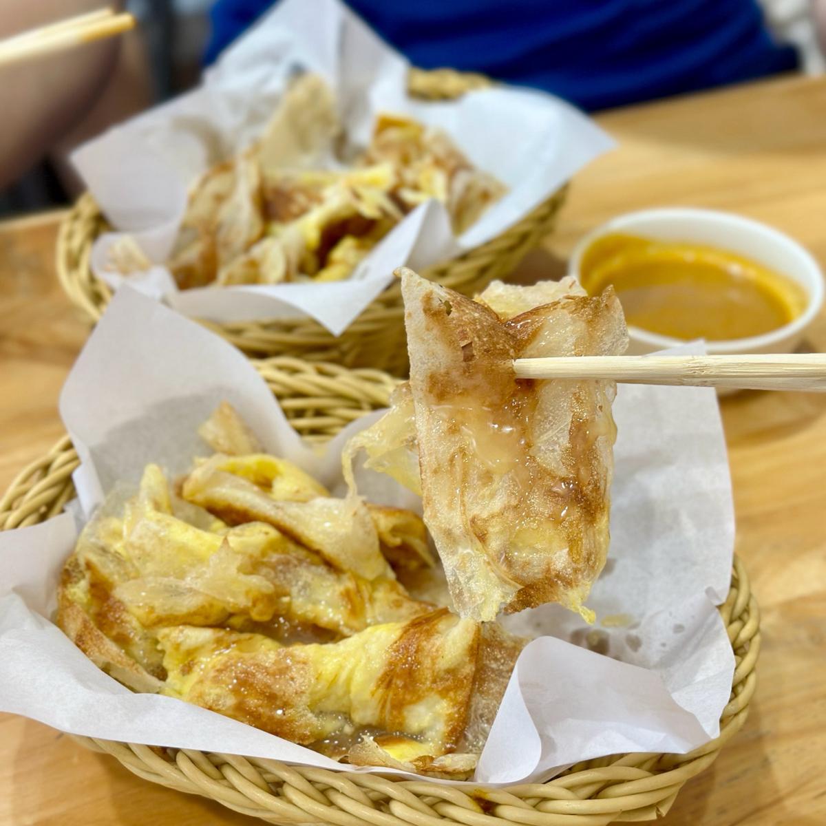✅ Indian Pancake: It comes in two signature flavors—curry and condensed milk—with the recent launch of new flavors like brown sugar and pepper salt. The pancake skin is quite crispy and filled with a rich egg aroma; it tastes great on its own and is not greasy at all. The condensed milk flavor offers a sweet and rich taste, while the curry flavor comes with a bowl of curry sauce for dipping. The curry sauce is full of spice but not overpowering.