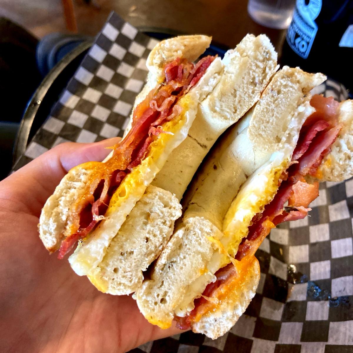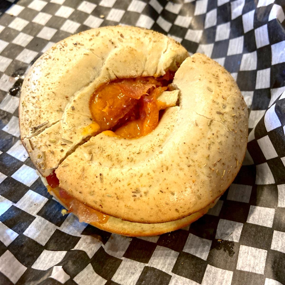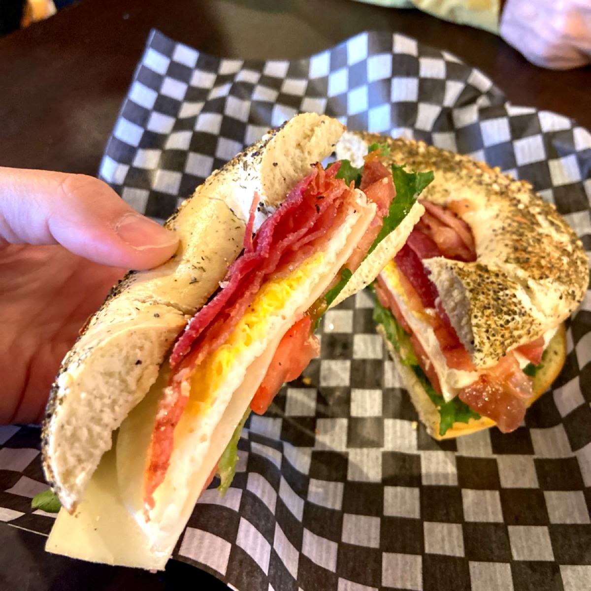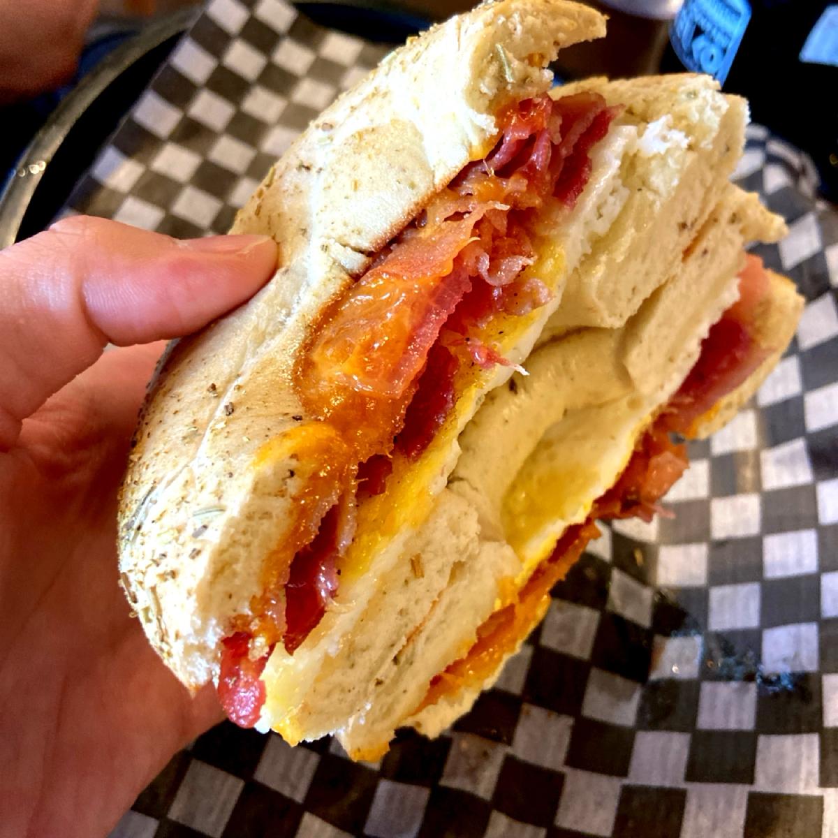 It's quite a basic breakfast flavor, with butter, egg, and cheddar, plus bacon. Without the vegetables, it’s a bit simpler but still tasty. Compared to BCLT, I think BCLT is tastier. The rosemary bagel has a subtle rosemary flavor, which is really good and quite special. I haven’t tasted it elsewhere. The bagel itself is highly recommended.
