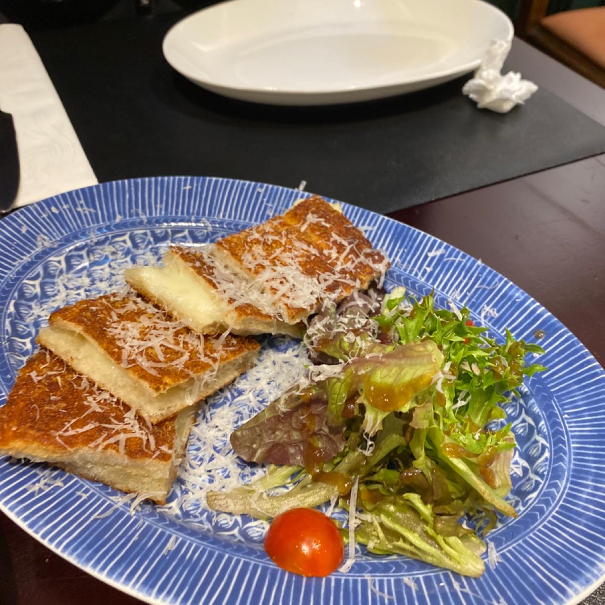 It's crispy and has a lot of cheese that makes it stringy.