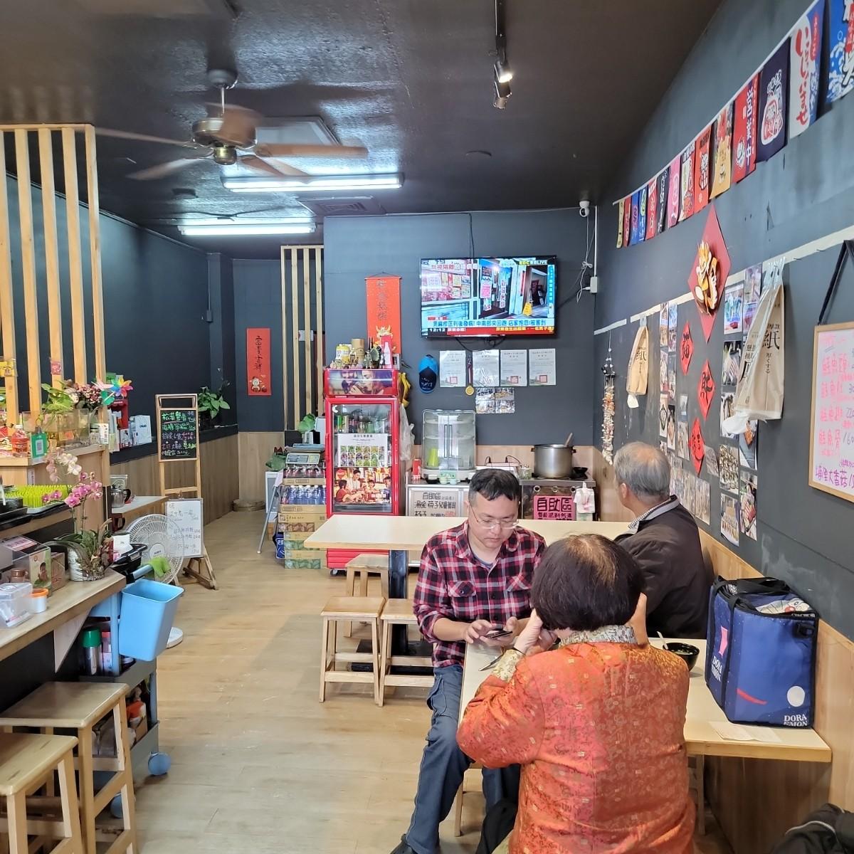 What catches your eye at the entrance is a black-and-white cat resembling a dairy cow; I initially thought it was a wild cat, but it isn’t afraid of people. Later, I found out it’s the store cat. The interior of the shop is small, with many items hanging on the black walls. The counter has a sashimi and cooking area, and there is free miso soup available inside. The boss’s son, who looks to be in elementary school, helps with serving the food, and there’s a store dog standing at the entrance.