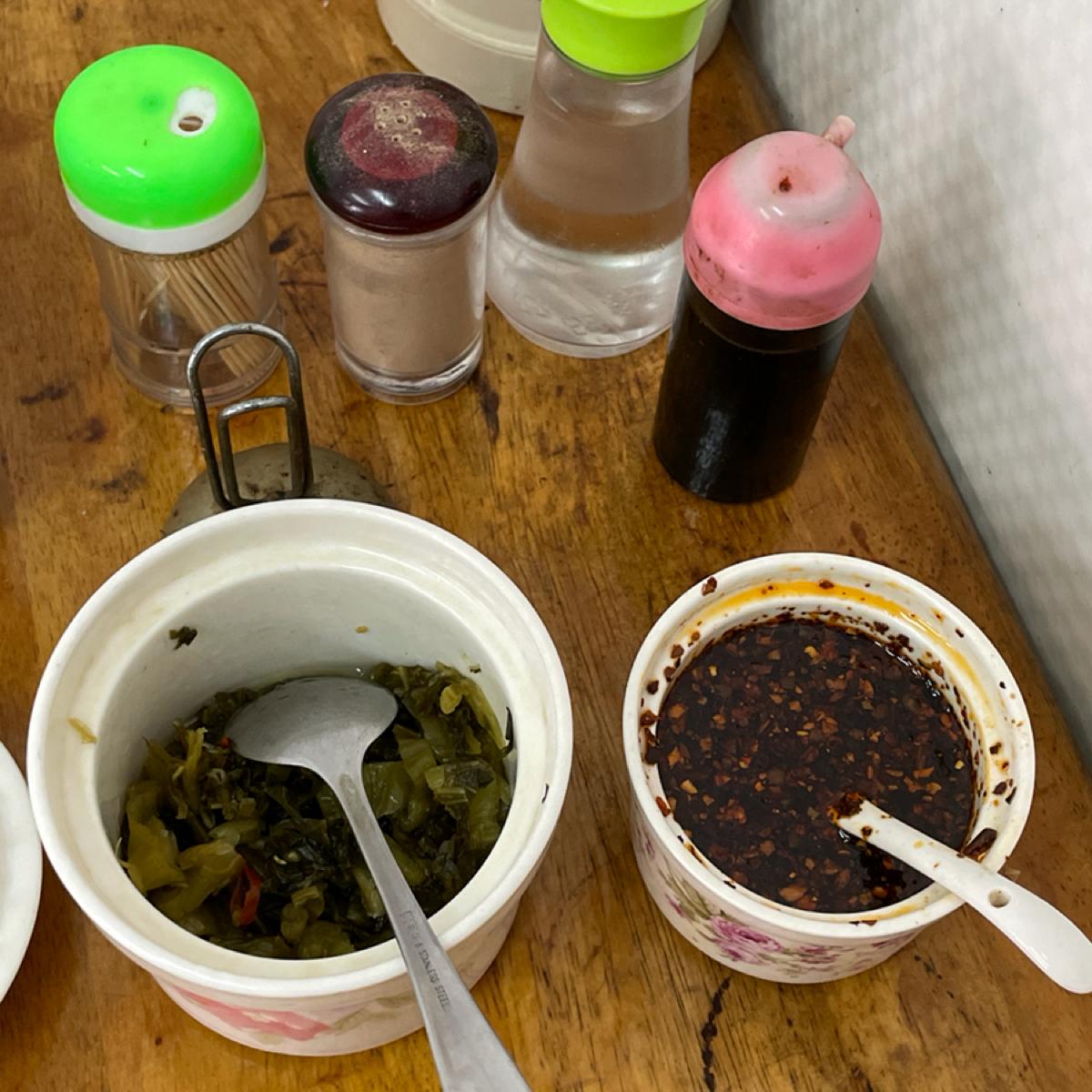 🔹Sauces are also on the table, including chili sauce, sauerkraut, pepper, and vinegar.