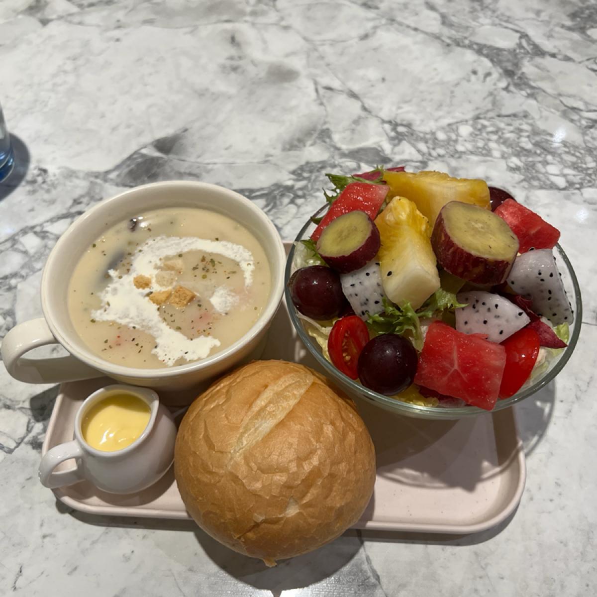 🥗 Add a set meal for $180. The French creamy mushroom soup is smooth and fragrant, and the round bread is crispy on the outside and soft on the inside, perfect for dipping in the soup. The salad is fresh, refreshing, and generous in portion, with a wide variety of fruits.