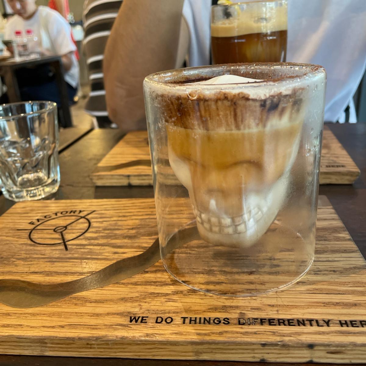 I didn’t like the Moscow cup I ordered that much. It has a cool shape like a skull💀It has a very sweet milk cap on the surface, and chocolate sauce and milk & concentrate on the bottom? I'm not sure, but I can't taste the coffee aroma. It feels more like a children's meal overall!