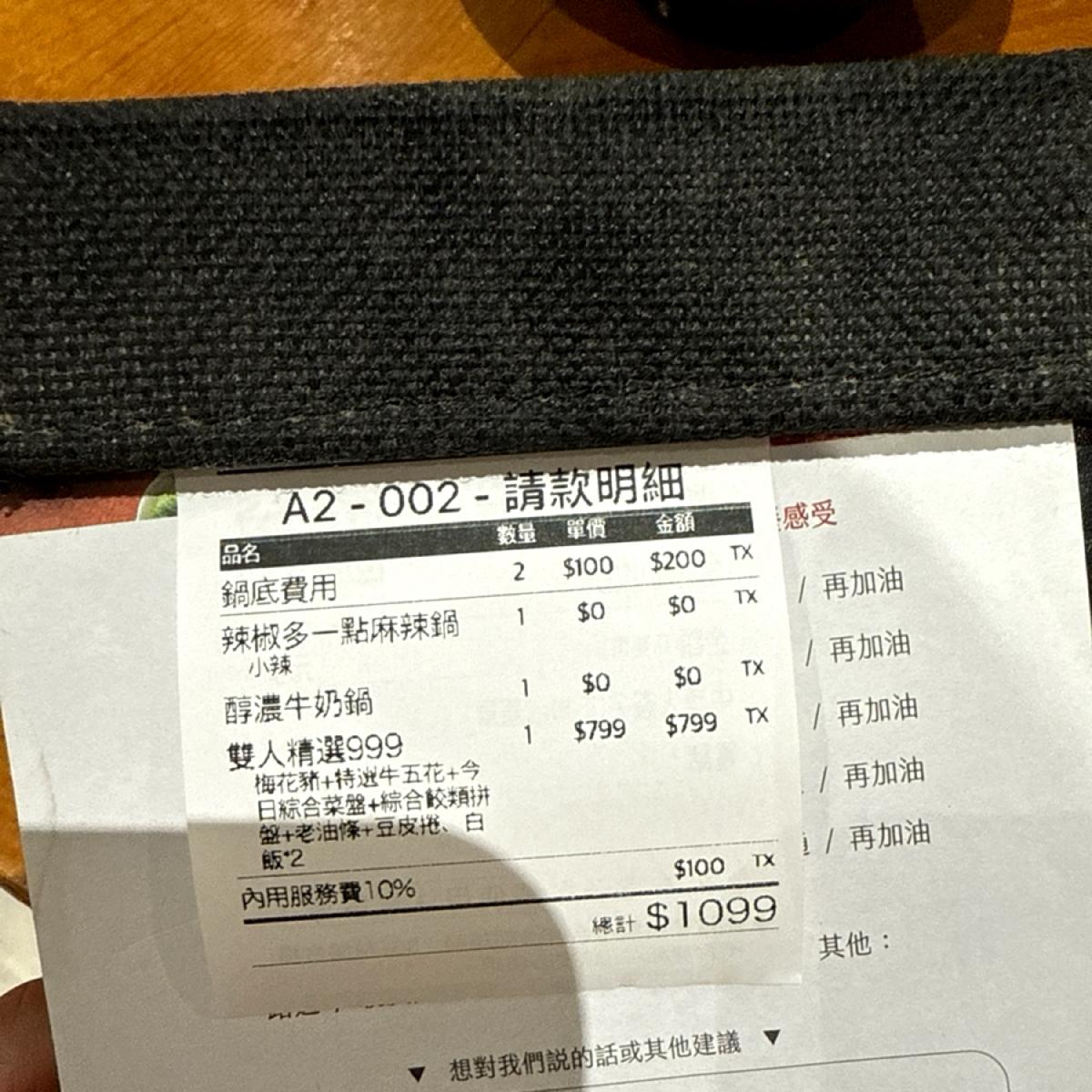 We were super full after the meal. Dividing the broth cost, it came to 550 NTD per person, which is acceptable. The vegetables were very fresh, and the portion of meat was large with beautiful marbling. The set also includes fried dough sticks, a great companion for spicy hot pot, so there's no need to order them separately. I personally think it’s a fantastic deal. The milk pot even comes with a slice of cheese; you can enjoy it plain first and then add the cheese for a richer flavor. Cooking vegetables in it will soak them in a wonderful creamy taste, and it is really delicious! 🥺 After the meal, having a mochi ice cream feels truly satisfying!