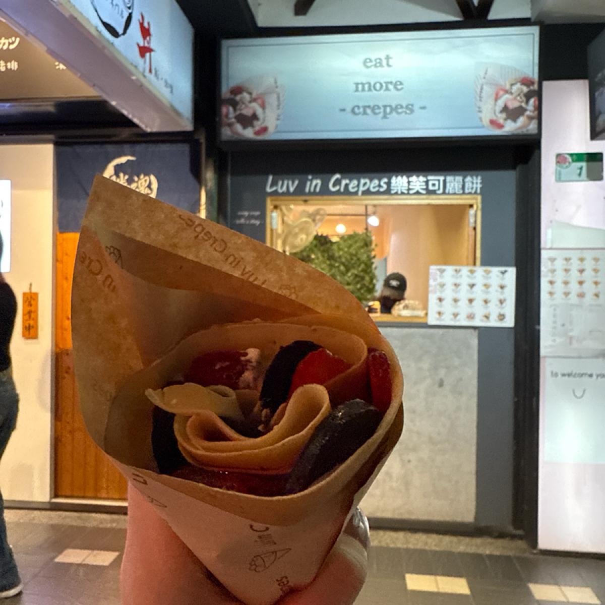 At Luv in Crepes in the streets of Shilin, Taipei. I saw a post about this place on Threads and went to try it out in the evening. The shop is located in the Shilin District, and there was quite a line of people waiting. I arrived at 8:30 PM and was lucky enough to buy the second-to-last crepe! They make each crepe fresh upon ordering, so there's a bit of a wait; I waited about 13 minutes that day.