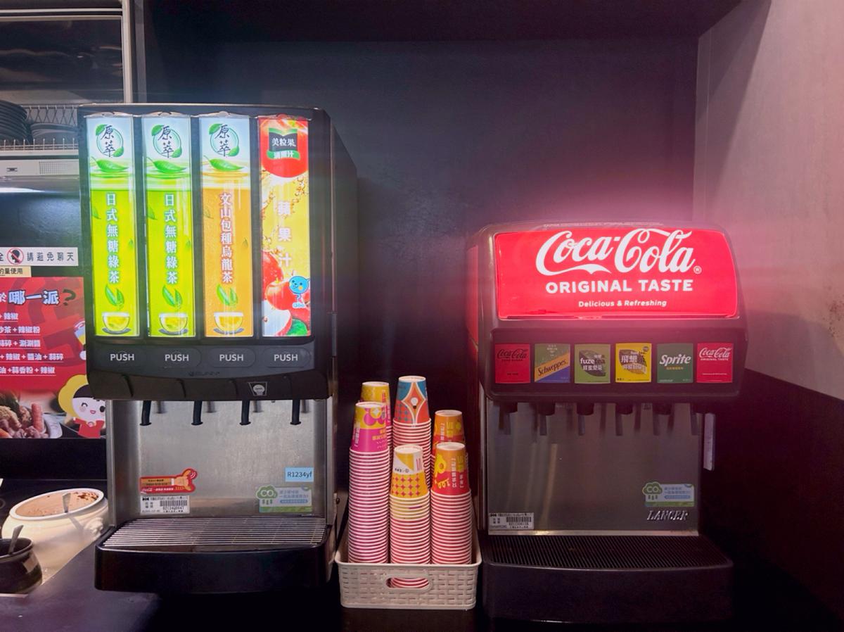 Which has drink machines, sauces, white rice, and a soup refill station.